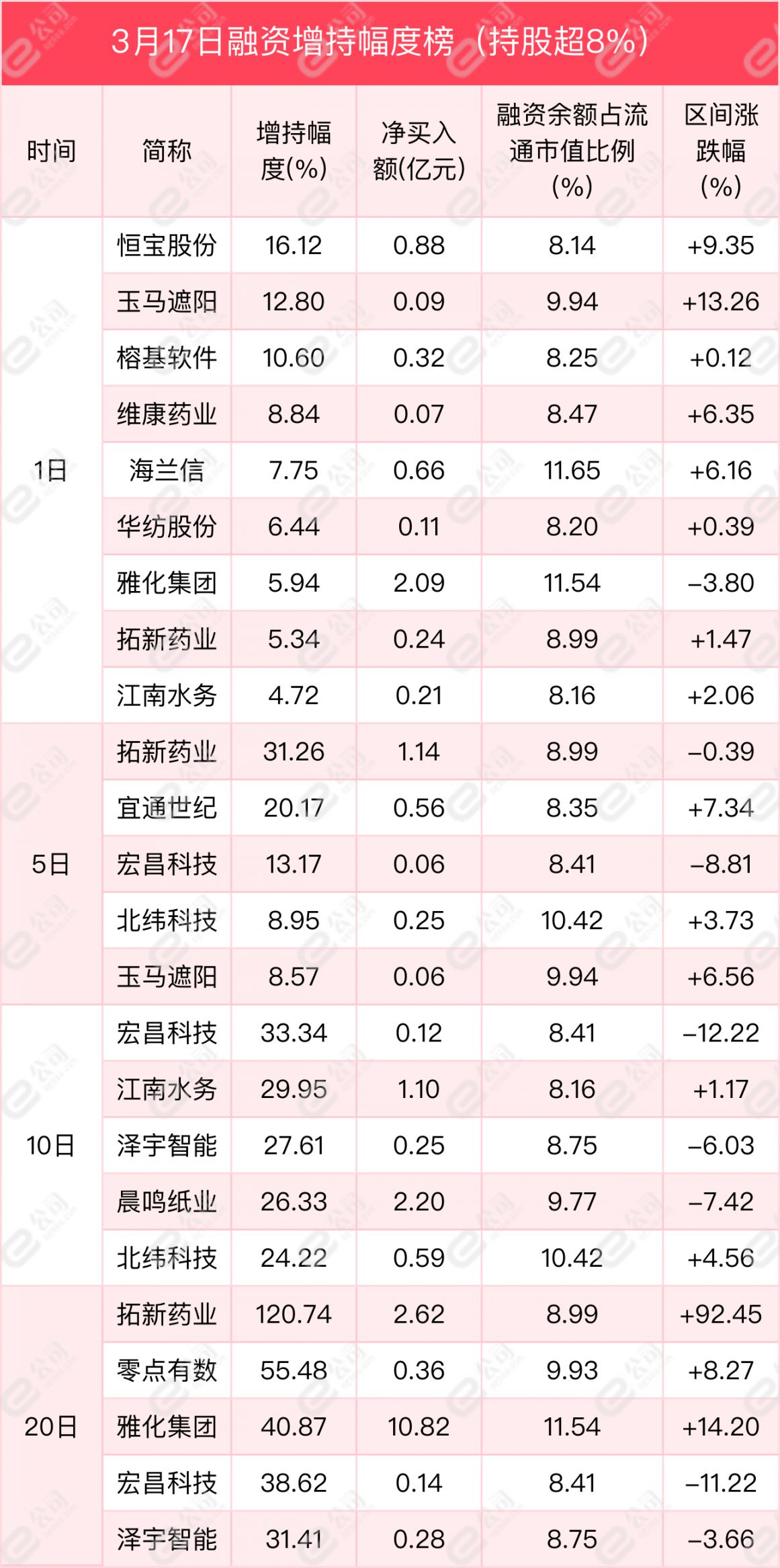 从增减持幅度来看,融资余额占流通股比例超8%的个股中,恒宝股份、玉马遮阳、榕基软件获融资增持幅度居前,分别为16.12%、12.8%、10.6%。
