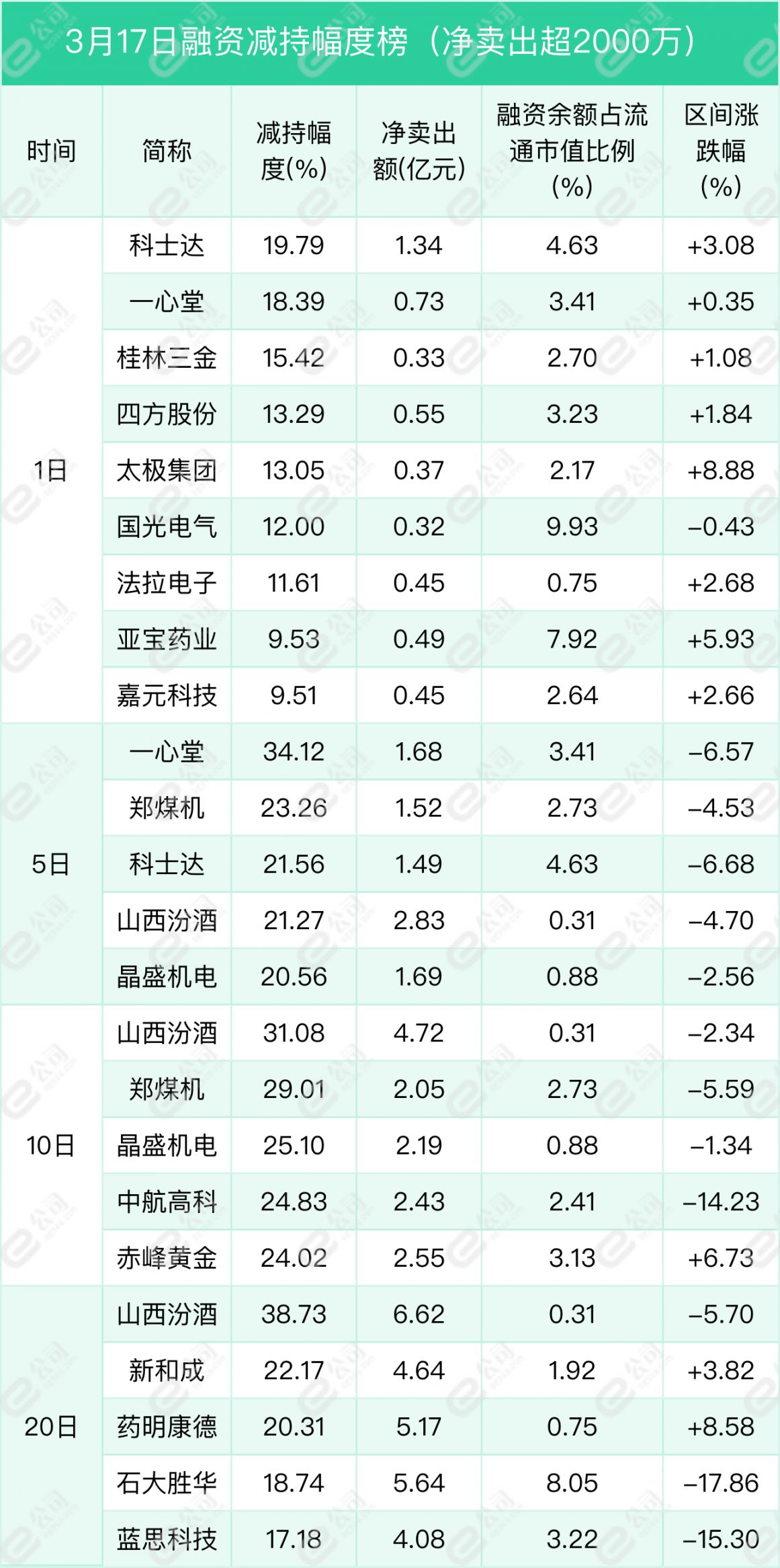 科士达、一心堂、桂林三金遭融资减持幅度居前,分别为19.79%、18.39%、15.42%。