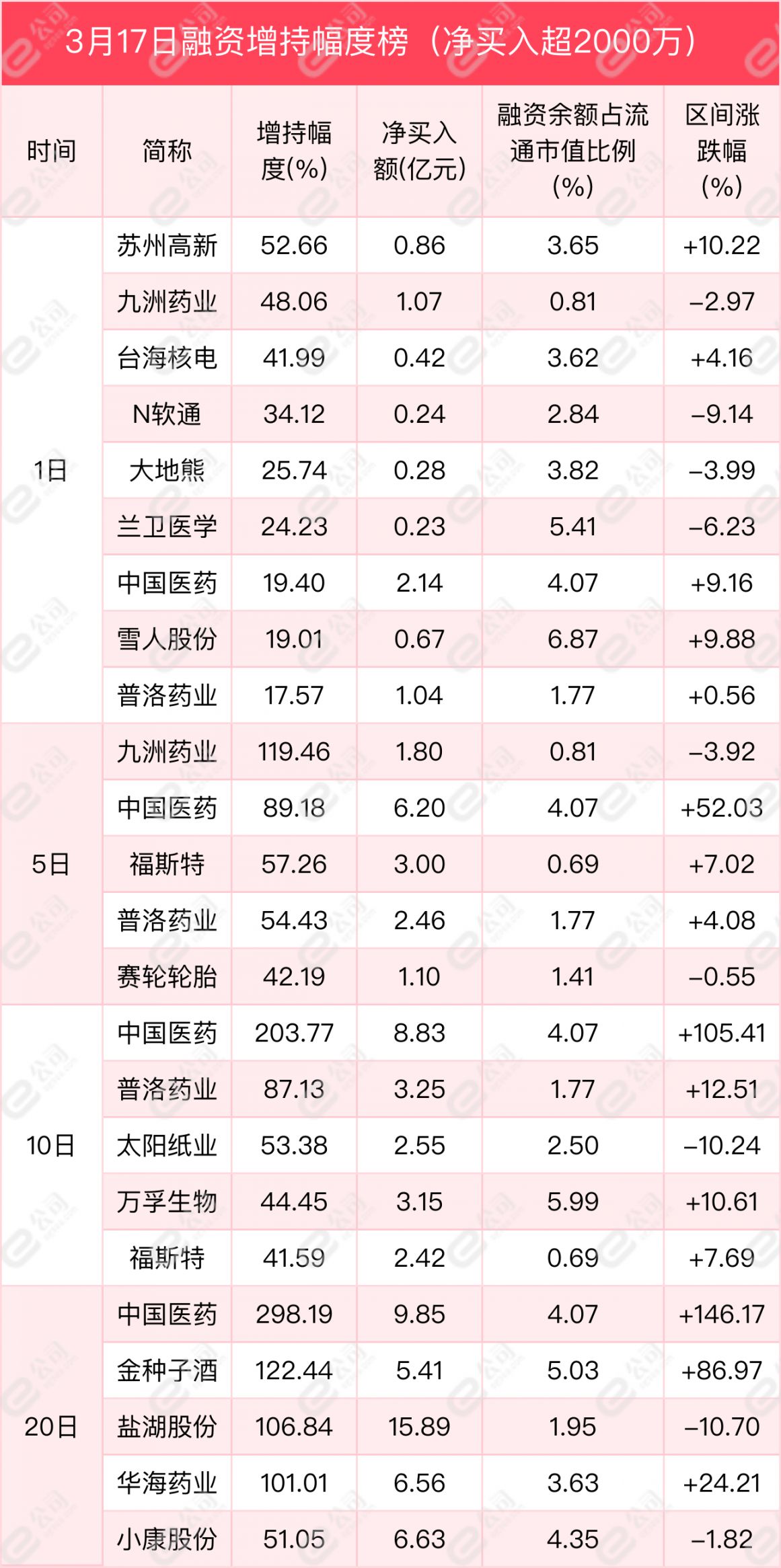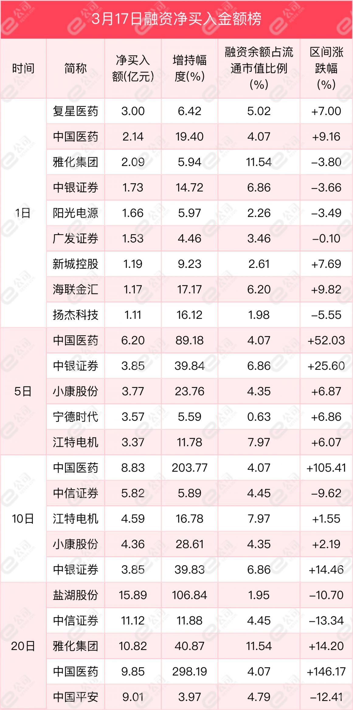 从买卖金额来看,复星医药、中国医药、雅化集团获融资净买入金额居前,分别为3亿元、2.14亿元、2.09亿元,增持幅度分别为6.42%、19.4%、5.94%。