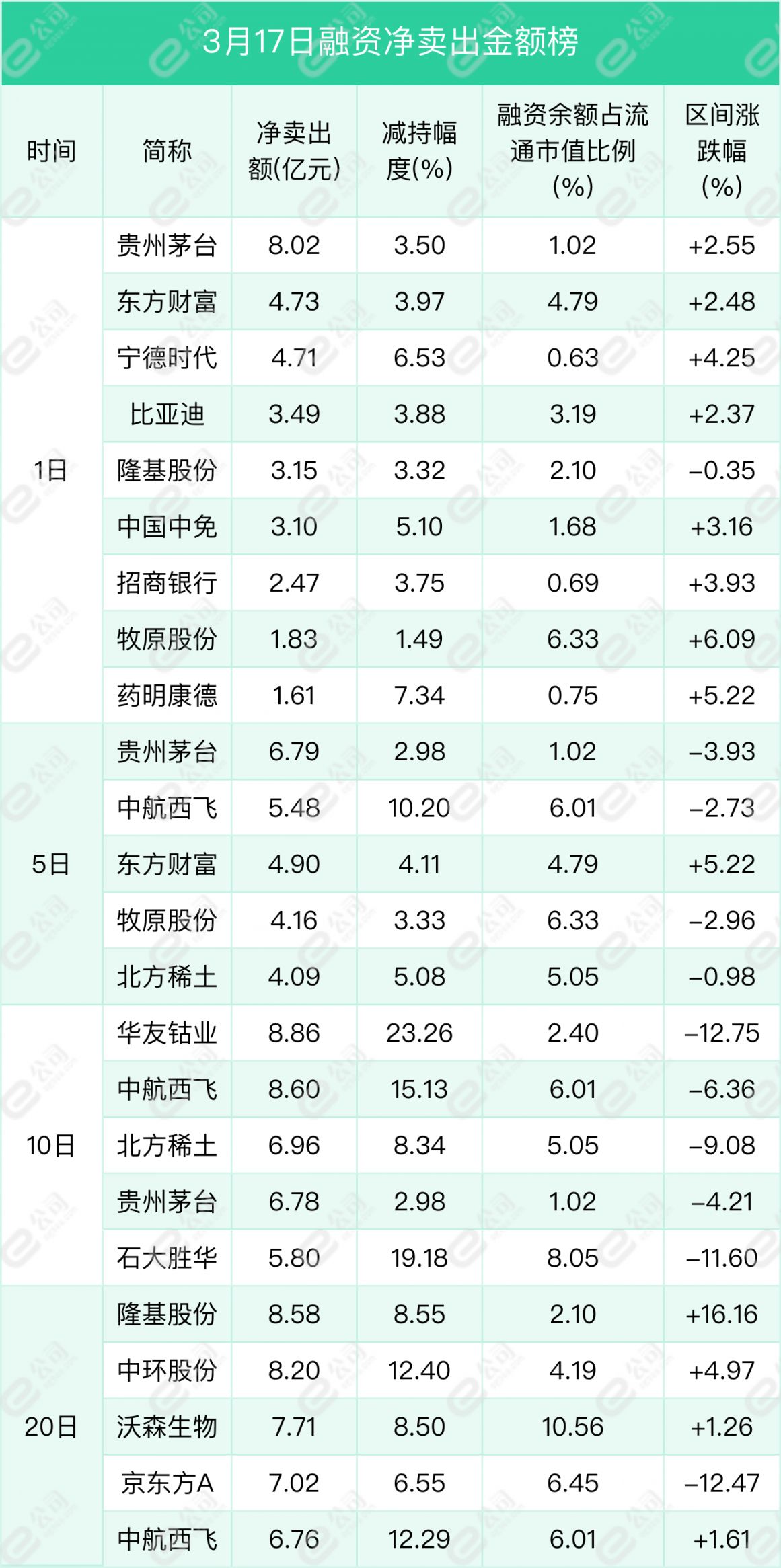 贵州茅台、东方财富、宁德时代遭融资净卖出金额居前,分别为8.02亿元、4.73亿元、4.71亿元,减持幅度分别为3.5%、3.97%、6.53%。