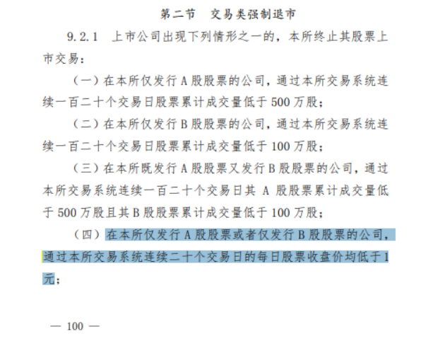 《深圳证券交易所股票上市规则》(2022 年修订)9.2.1条规定,在本所仅发行 A 股股票或者仅发行 B 股股票的公司,通过本所交易系统连续二十个交易日的每日股票收盘价均低于1元的,本所终止其股票上市交易。