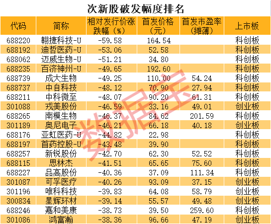 破发成为常态,今年破发比例已超60%,破发占比创出十年新高。以近一年上市次新股看,最新价破发的个股数量则达到140多只。翱捷科技-U、迪哲医药-U、迈威生物-U等个股破发幅度超过50%,百济神州-U、成大生物 、中自科技等10多只个股破发幅度40%至50%,唯科科技、星辉环材、嘉和美康等20多只个股破发幅度30%至40%。