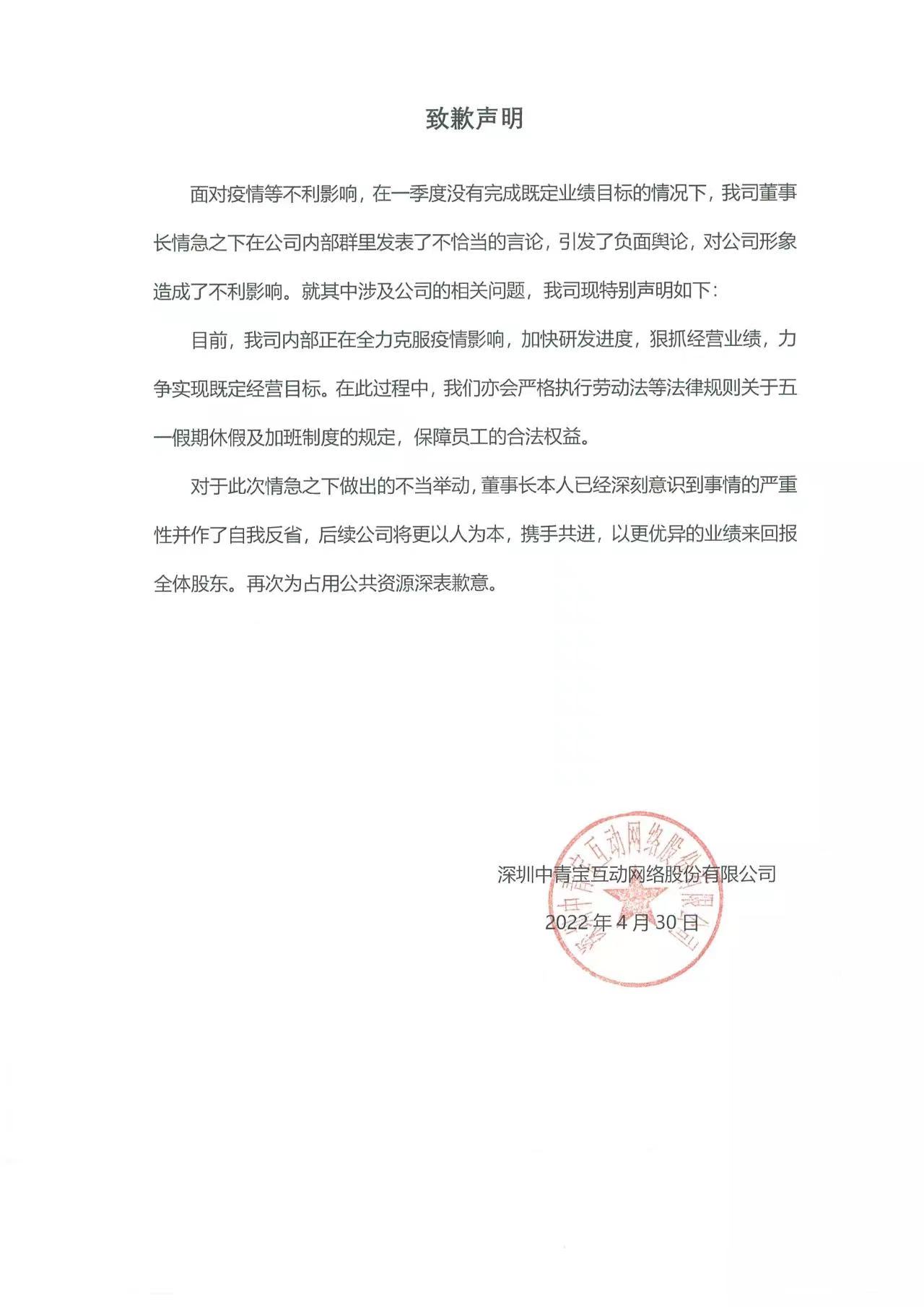 e公司讯,中青宝就近期公司高管内部群发表不当言论发布致歉声明:目前,公司内部正在全力克服疫情影响,加快研发进度,狠抓经营业绩,力争实现既定经营目标。在此过程中,我们亦会严格执行劳动法等法律规则关于五一假期休假及加班制度的规定,保障员工的合法权益。对于此次情急之下做出的不当举动,董事长本人已经深刻意识到事情的严重性并作了自我反省,后续公司将更以人为本,携手共进,以更优异的业绩来回报全体股东。