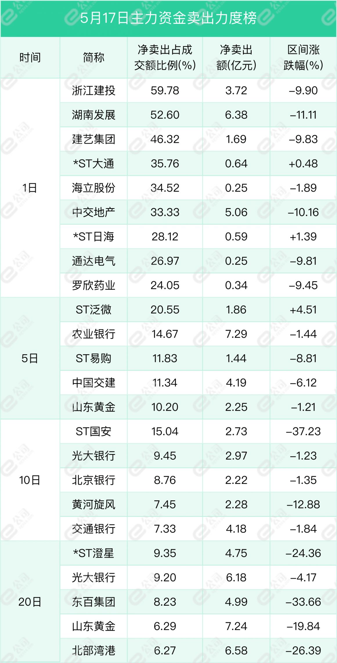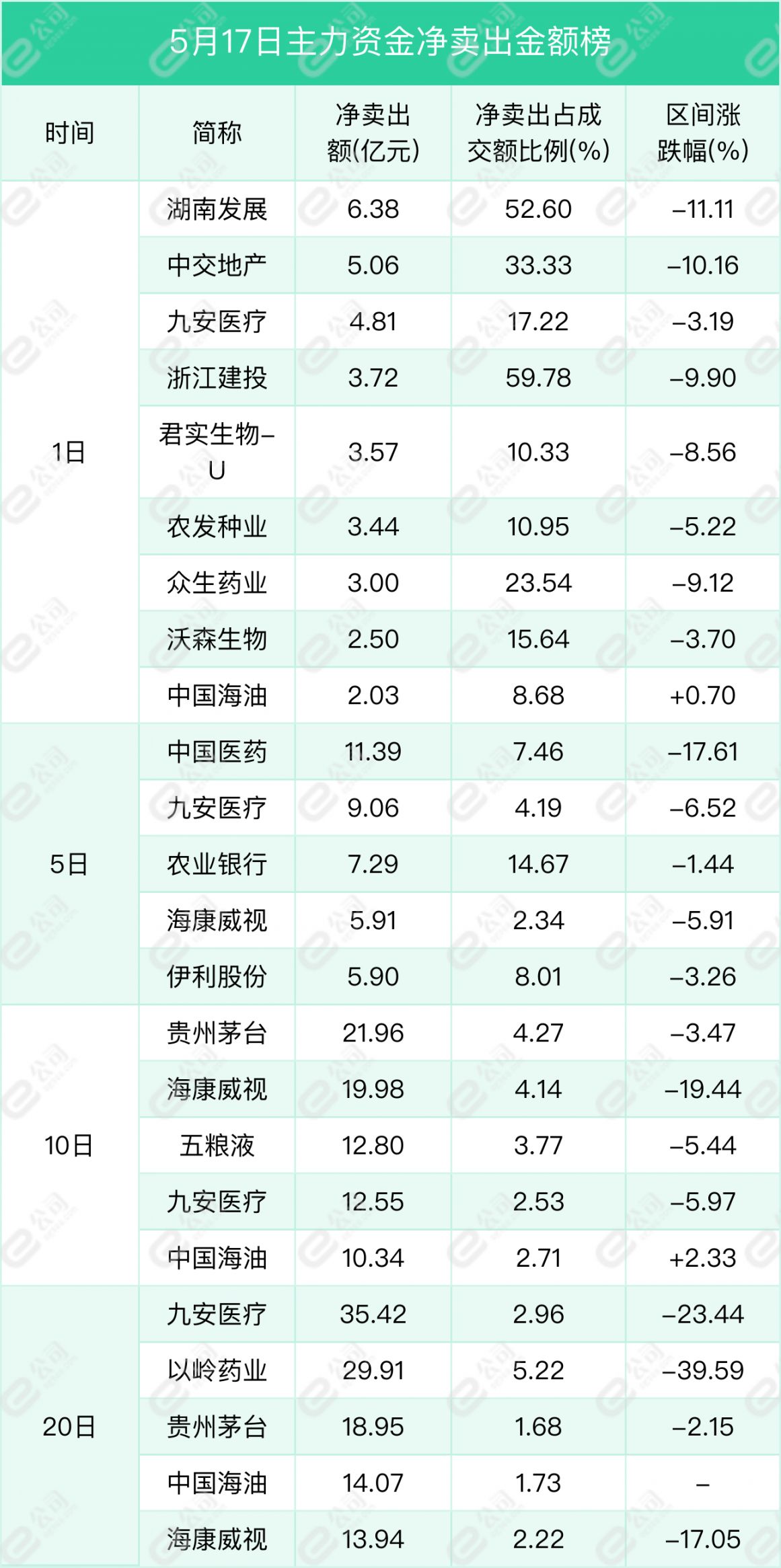 湖南发展、中交地产、九安医疗获主力资金净卖出金额居前,分别为6.38亿元、5.06亿元、4.81亿元,占当日成交额52.6%、33.33%、17.22%。
