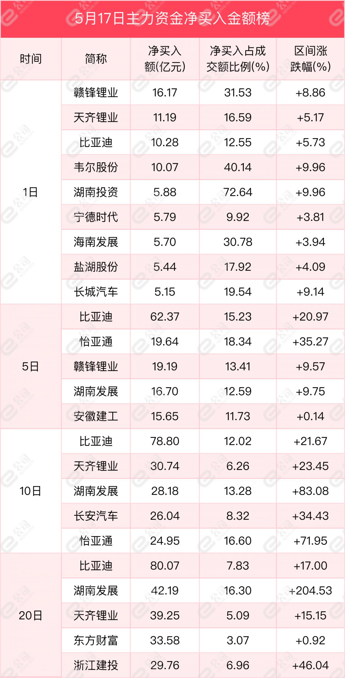 从买卖金额来看,赣锋锂业、天齐锂业、比亚迪获主力资金净买入金额居前,分别为16.17亿元、11.19亿元、10.28亿元,占当日成交额31.53%、16.59%、12.55%。