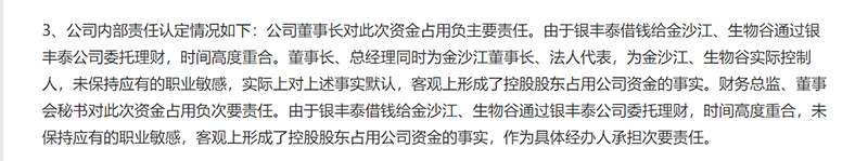 公司在对北交所问询函的回复中承认,公司董事长对此次资金占用负主要责任。由于银丰泰借钱给金沙江、生物谷通过银丰泰公司委托理财,时间高度重合。董事长、总经理同时为金沙江董事长、法人代表,为金沙江、生物谷实际控制人,未保持应有的职业敏感,实际上对上述事实默认,客观上形成了控股股东占用公司资金的事实。