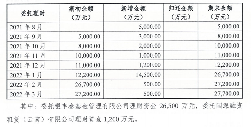 经过公司自查自纠和大股东陈述,这2.77亿元用于控股股东金沙江其他产业经营及归还债务。另外,委托理财的第三方机构一共有两家。其中,委托银丰泰基金管理有限公司(下称“银丰泰”)的理财资金为2.65亿元,委托国深融资租赁(云南)有限公司(下称“国深融”)理财的资金为1200万元。
