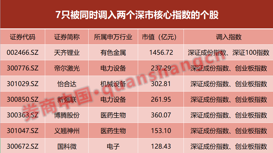 具体而言,此次深证成指将更换25只样本股,创业板指将更换10只样本股,深证100将更换4只样本股。从行业分布来看,此次新调入的32只样本股主要扎堆电力设备、国防军工、电子、有色等“硬核”板块,其中还包括龙源电力、天齐锂业、天山股份3只千亿市值股。