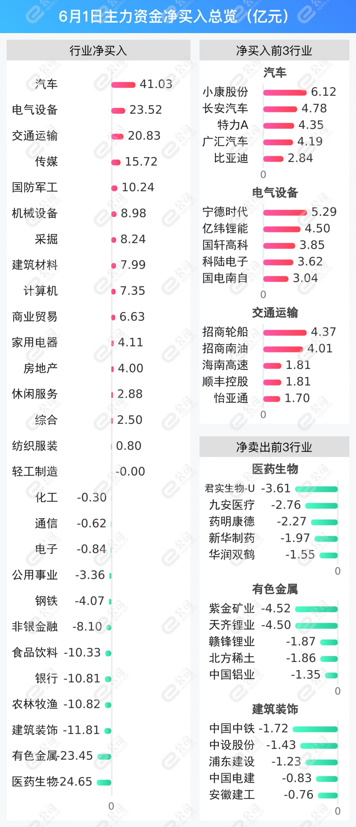 从行业层面看,汽车、电气设备、交通运输获主力资金净买入金额居前,分别为41.03亿元、23.52亿元、20.83亿元。