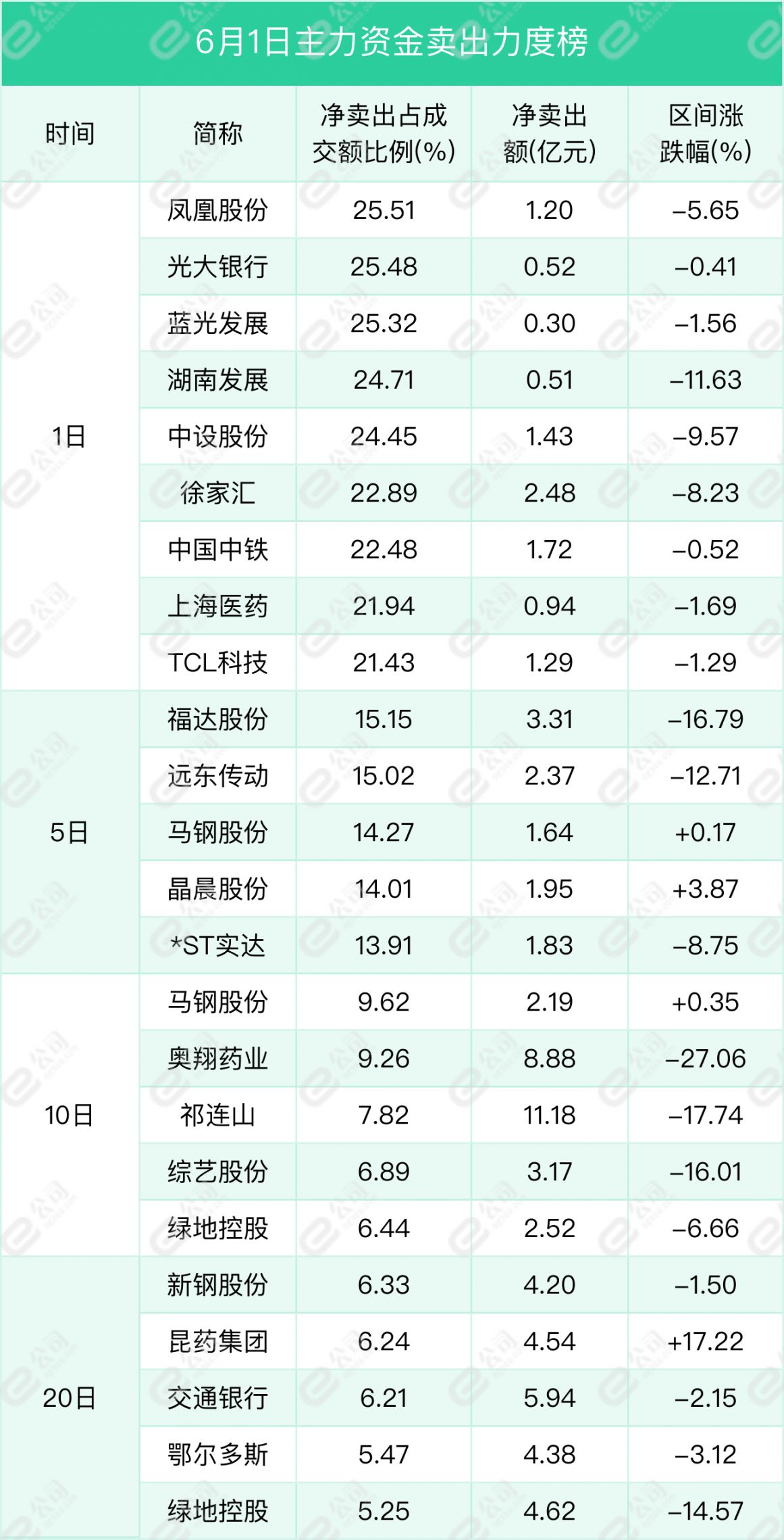 凤凰股份、光大银行、蓝光发展遭主力资金大力卖出,净卖出额占当日成交额比例分别为25.51%、25.48%、25.32%,净卖出额分别为1.2亿元、0.52亿元、0.3亿元。