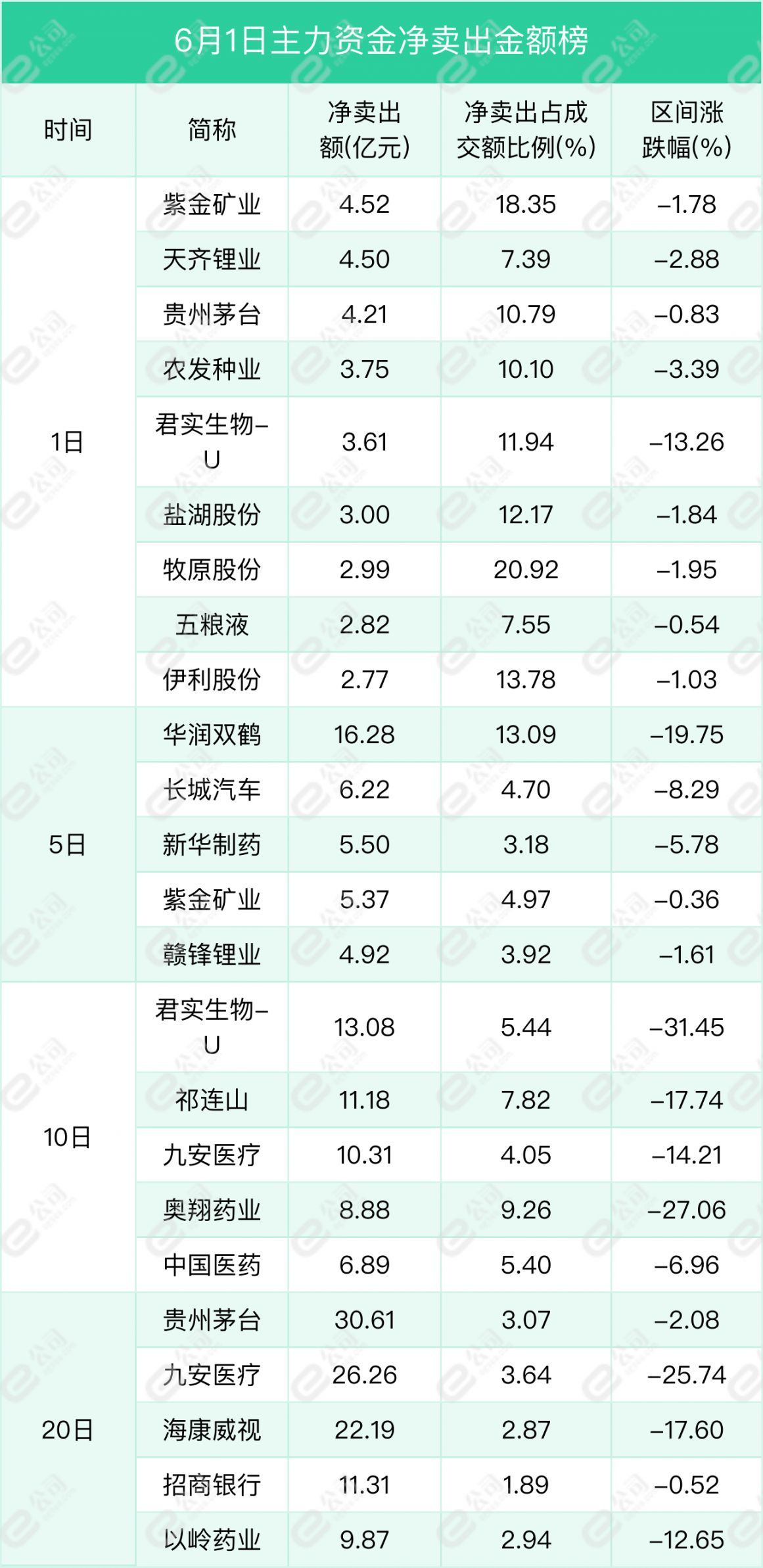 紫金矿业、天齐锂业、贵州茅台获主力资金净卖出金额居前,分别为4.52亿元、4.5亿元、4.21亿元,占当日成交额18.35%、7.39%、10.79%。