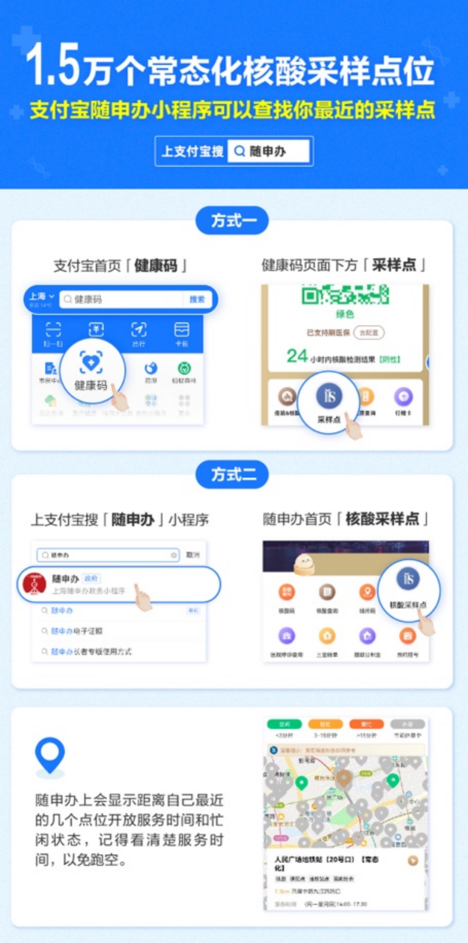 此外,记者获悉,上支付宝首页搜“上海”,进入“上海加油 全力以复”专区,设置了核酸采样、抗原自测等快捷入口。日前,上海已设置常态化核酸采样点位约1.5万个,单日最大检测能力达到850万管以上。用户可以在支付宝查询到这些采样点的具体地址、服务时间、忙闲情况,并提供地图导航服务。