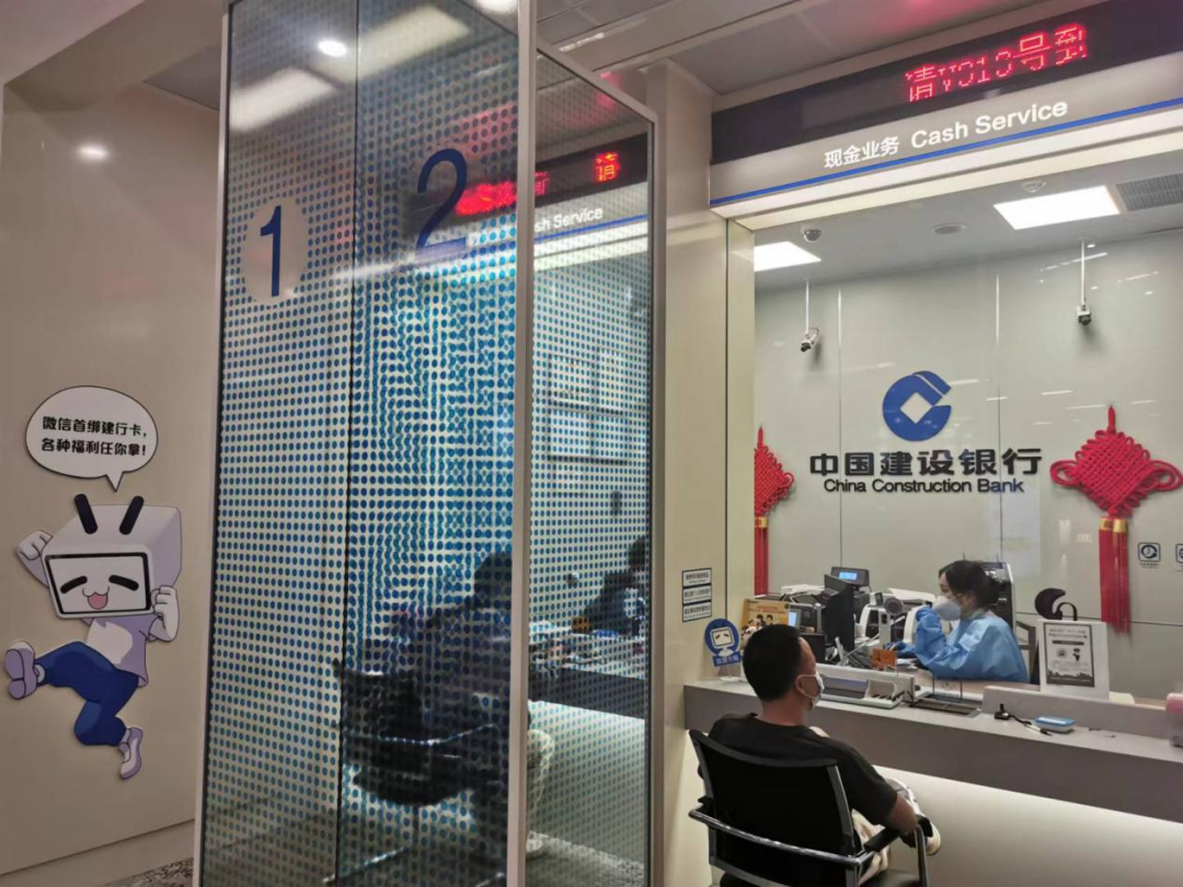 (建行上海浦东分行营业部内部通过物理隔离方便市民办理业务。)