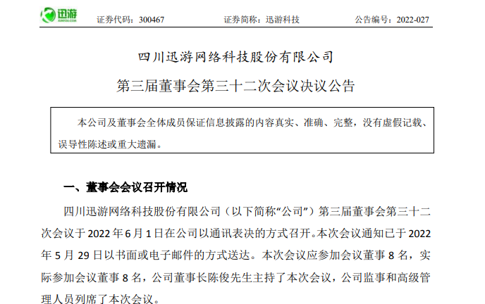3月9日,迅游科技以视频的方式召开了第三届董事会第二十八次会议,8名董事参加,董事长陈俊主持。其中一项《关于修订<印章管理规定>的议案》获得6票同意以及2票反对。反对者正是本次会议投出反对票的袁旭和张云帆。