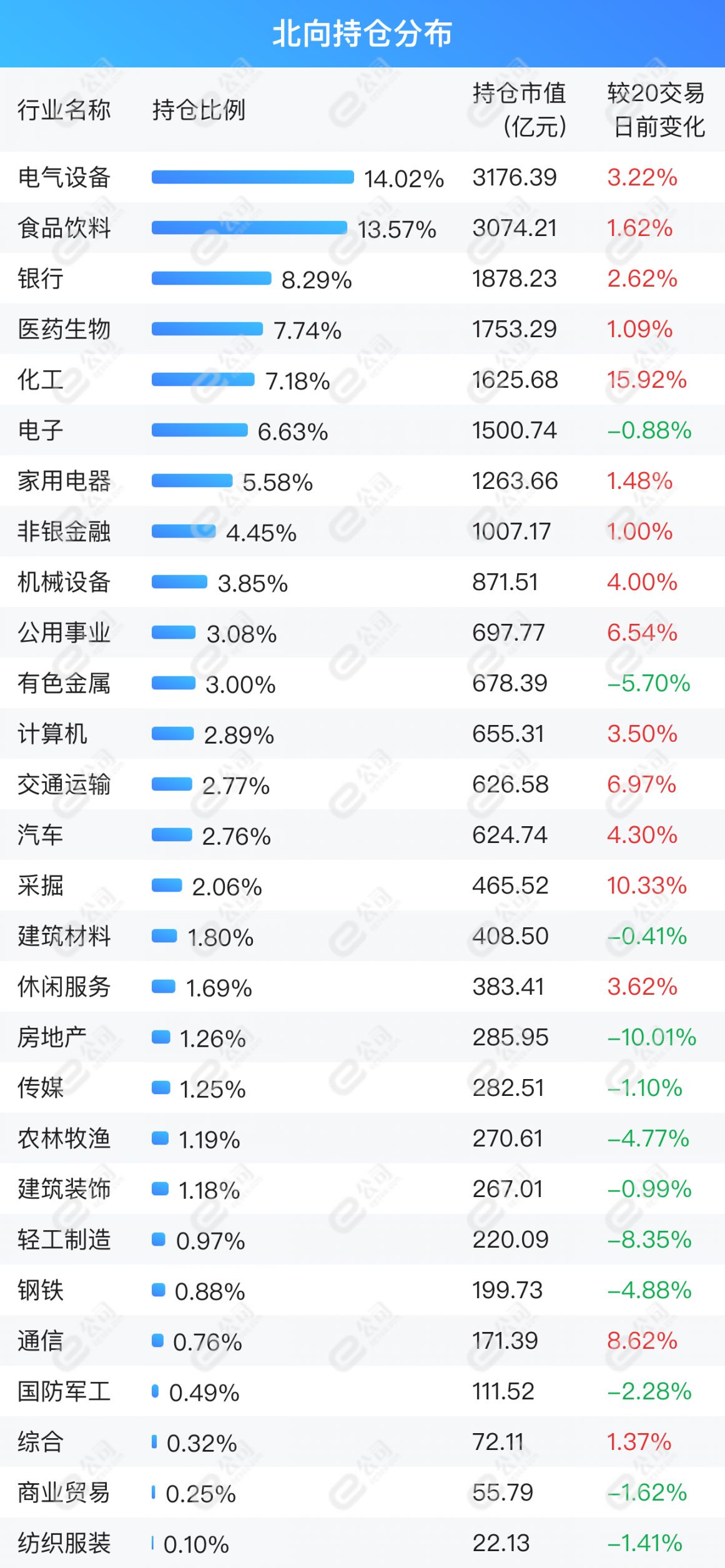 北向资金持仓市值前五行业为电气设备、食品饮料、银行、医药生物、化工,占持仓总市值50.81%。