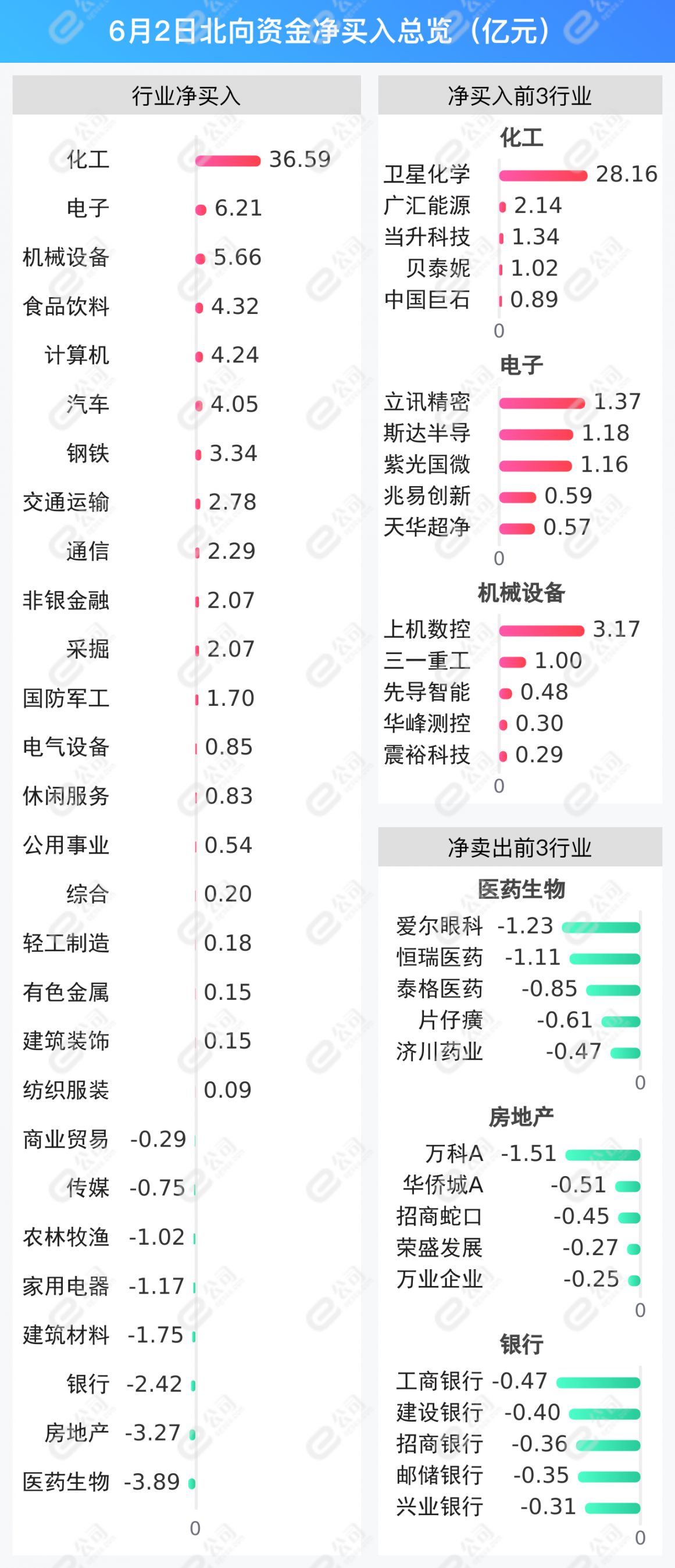 化工、电子、机械设备获北向资金净买入金额居前,分别为36.59亿元、6.21亿元、5.66亿元。