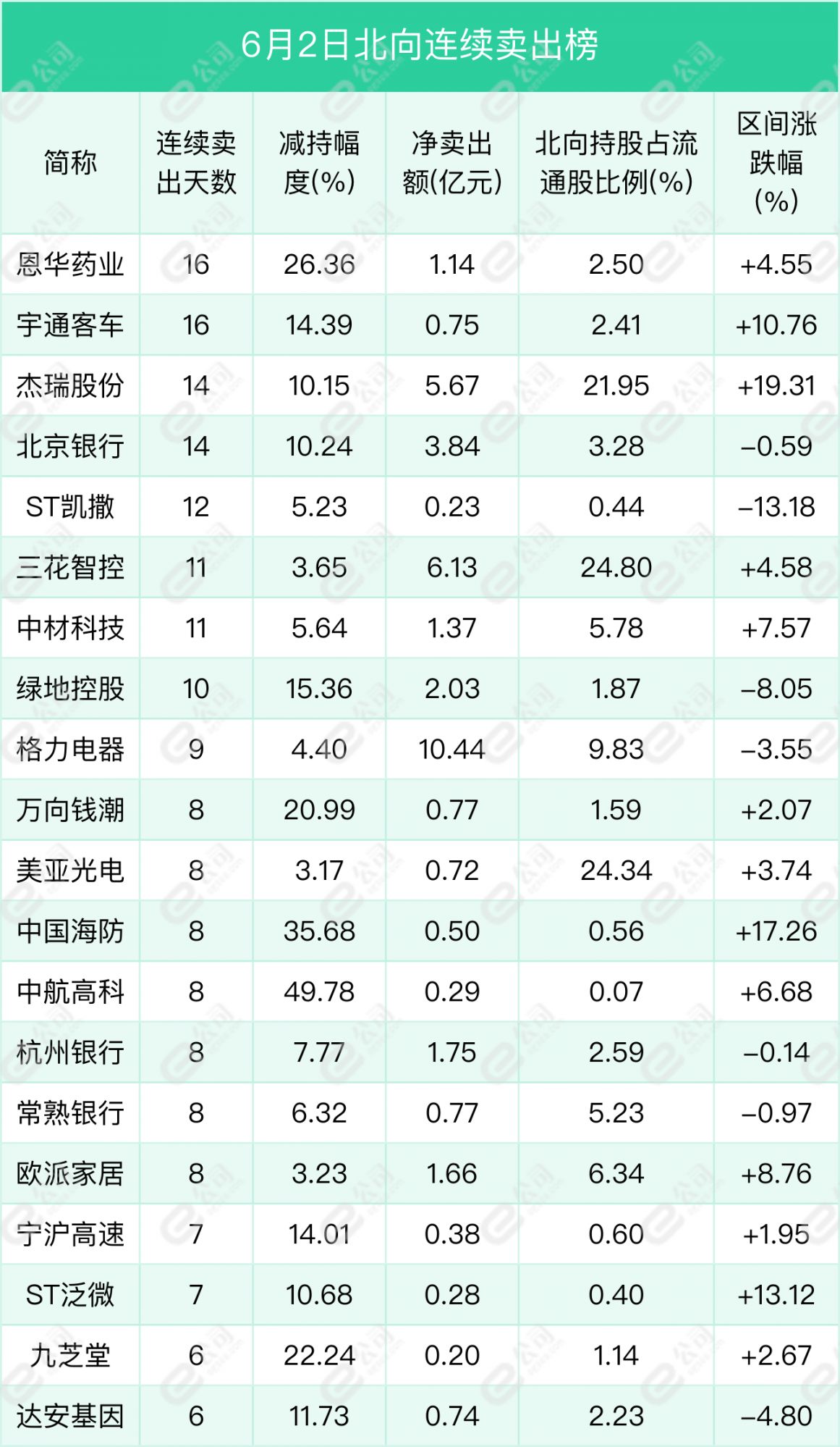 恩华药业、宇通客车、杰瑞股份遭北向资金连续净卖出天数居前,分别为16天、16天、14天,期间净卖出额分别为1.14亿元、0.75亿元、5.67亿元,期间减持幅度分别为26.36%、14.39%、10.15%。