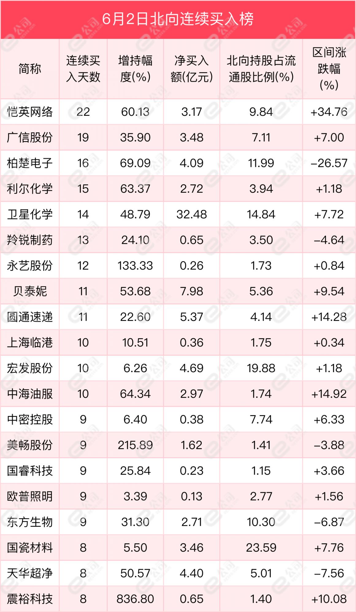 从连续买卖来看,恺英网络、广信股份、柏楚电子获北向资金连续净买入天数居前,分别为22天、19天、16天,期间净买入额分别为3.17亿元、3.48亿元、4.09亿元,期间增持幅度分别为60.13%、35.9%、69.09%。