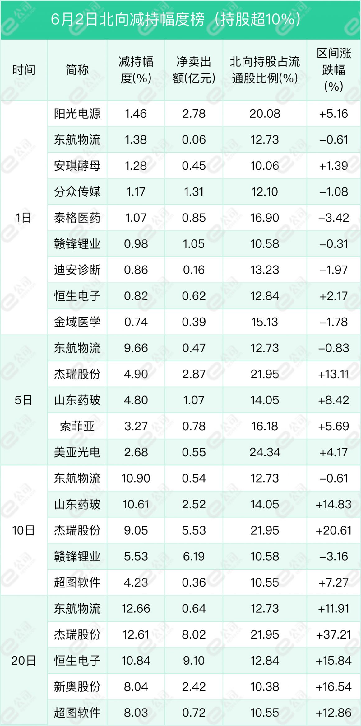 阳光电源、东航物流、安琪酵母遭北向资金减持幅度居前,分别为1.46%、1.38%、1.28%。