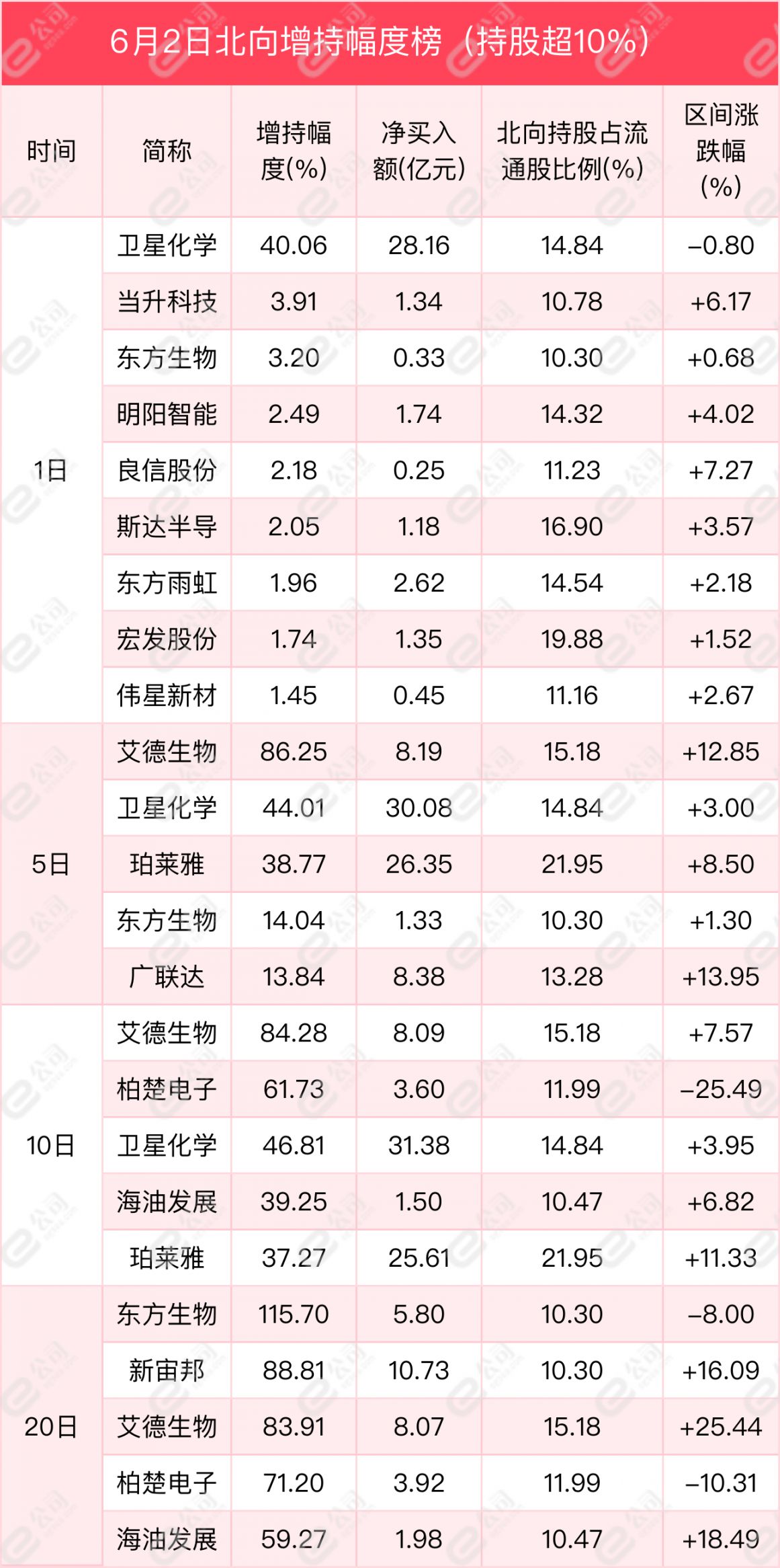 从增减持幅度来看,北向资金持股占流通股比例超10%的个股中,卫星化学、当升科技、东方生物获北向资金增持幅度居前,分别为40.06%、3.91%、3.2%。