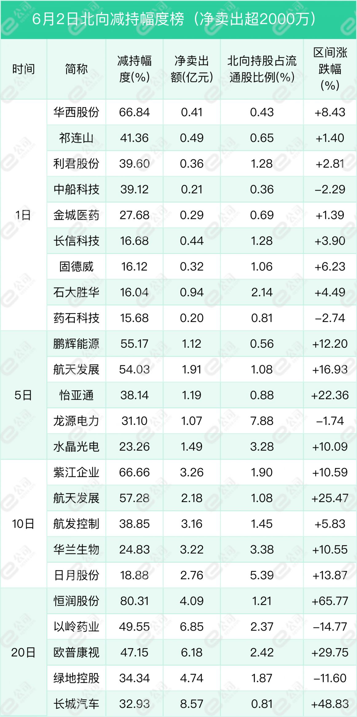 华西股份、祁连山、利君股份遭北向资金减持幅度居前,分别为66.84%、41.36%、39.6%。