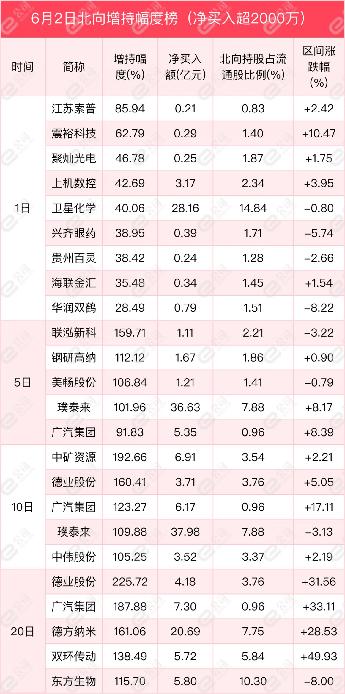 从增减持幅度来看,单日净买卖超2000万元以上的个股中,江苏索普、震裕科技、聚灿光电获北向资金增持幅度居前,分别为85.94%、62.79%、46.78%。