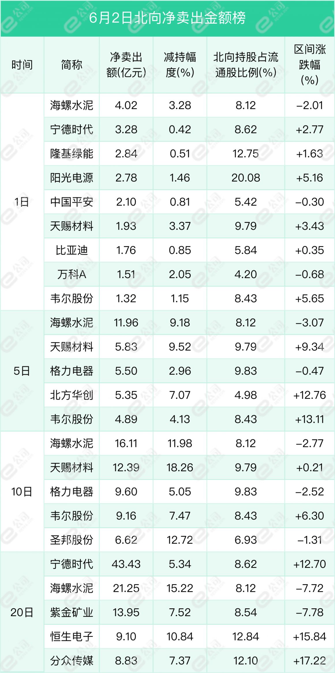 海螺水泥、宁德时代、隆基绿能遭北向资金净卖出金额居前,分别为4.02亿元、3.28亿元、2.84亿元,减持幅度分别为3.28%、0.42%、0.51%。