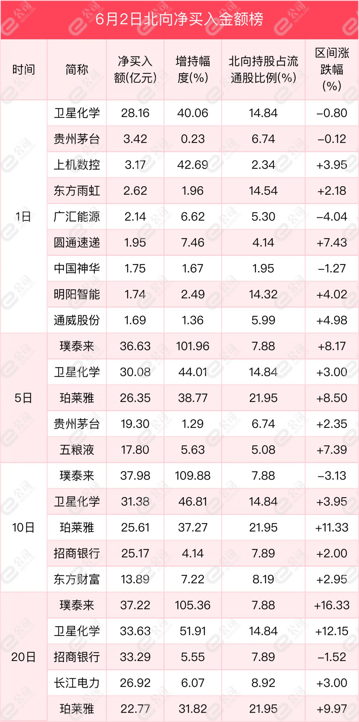 从买卖金额来看,卫星化学、贵州茅台、上机数控获北向资金净买入金额居前,分别为28.16亿元、3.42亿元、3.17亿元,增持幅度分别为40.06%、0.23%、42.69%。