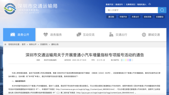 6月7日,深圳市交通运输局发布《关于开展普通小汽车增量指标专项摇号活动的通告》(下称《通告》),明确了全市新增投放的2万个普通小汽车增量指标专项摇号活动时间、指标使用条件、申请人资格、审核程序等。
