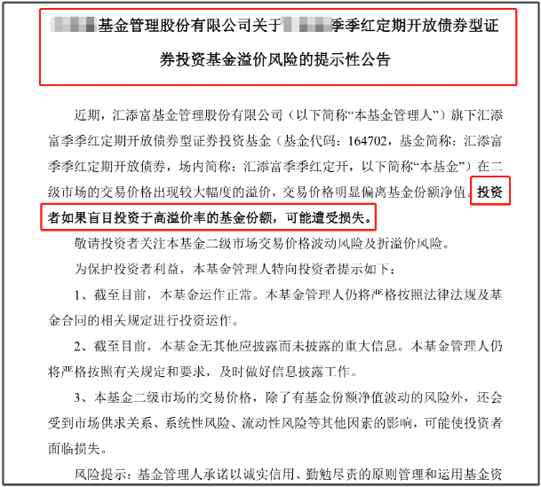 6月9日,一家大型公募旗下季季红定开基金发布公告称,近期,该只基金在二级市场的交易价格出现较大幅度的溢价,交易价格明显偏离基金份额净值。投资者如果盲目投资于高溢价率的基金份额,可能遭受损失。