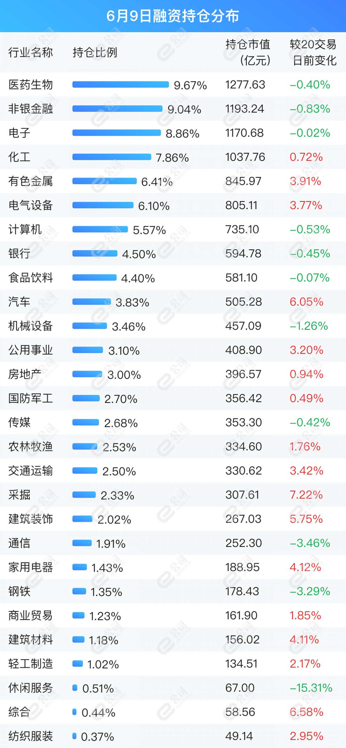 e公司数据统计显示,截至6月9日,融资持仓市值前五行业为医药生物、非银金融、电子、化工、有色金属,占持仓总市值41.84%。