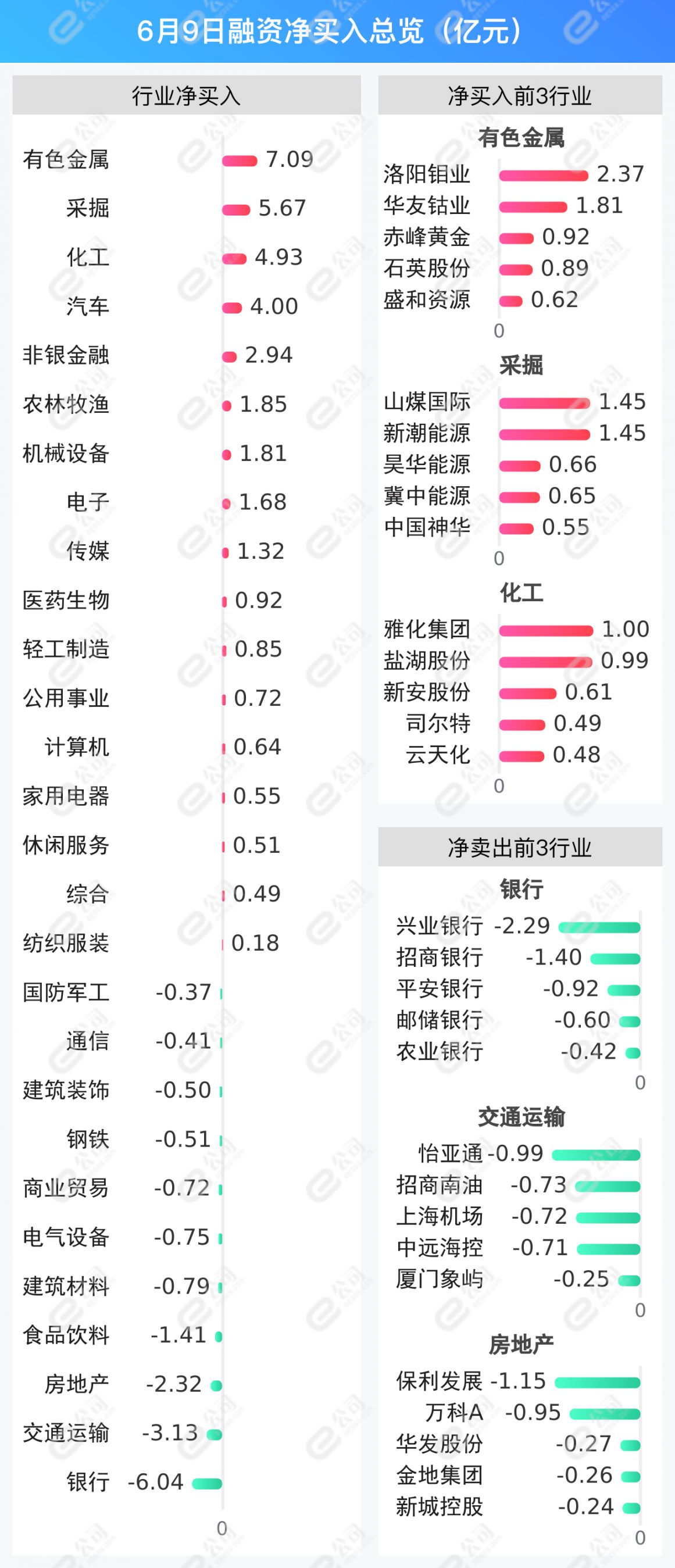 有色金属、采掘、化工获融资净买入金额居前,分别为7.09亿元、5.67亿元、4.93亿元。