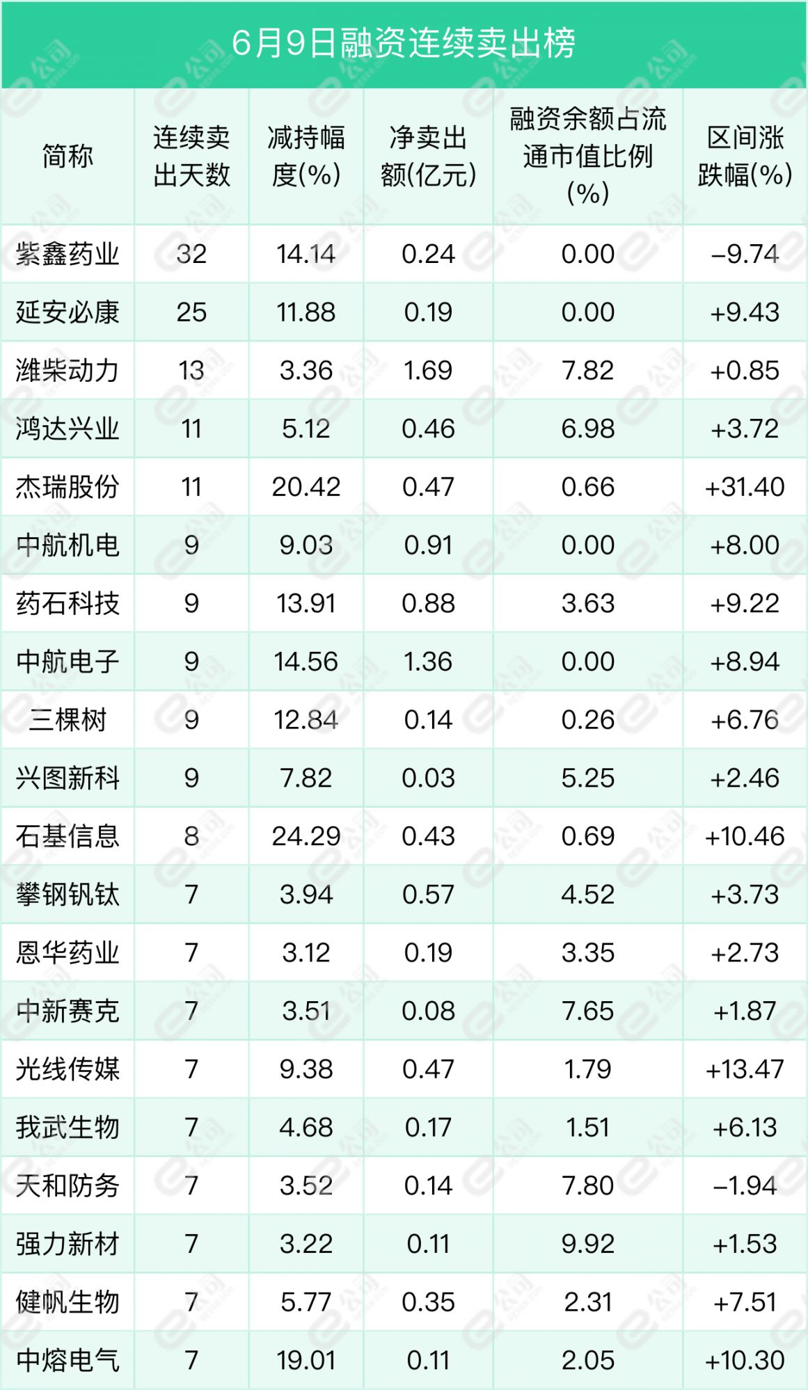 紫鑫药业、延安必康、潍柴动力遭融资连续净卖出天数居前,分别为32天、25天、13天,期间净卖出额分别为0.24亿元、0.19亿元、1.69亿元,期间减持幅度分别为14.14%、11.88%、3.36%。