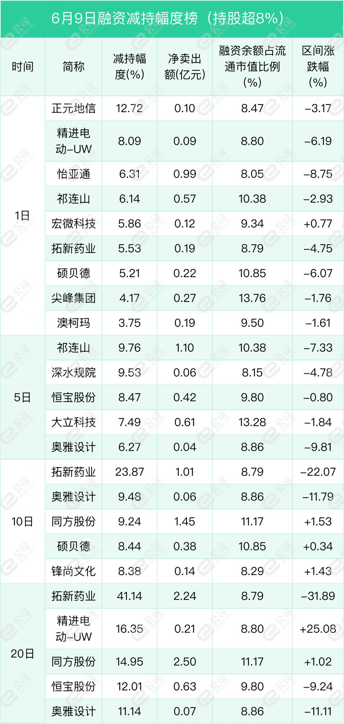 正元地信、精进电动-UW、怡亚通遭融资减持幅度居前,分别为12.72%、8.09%、6.31%。