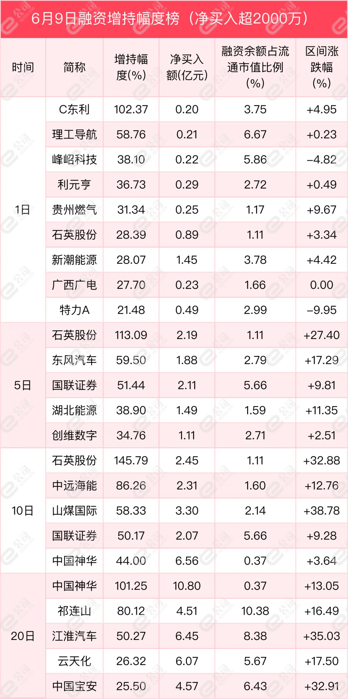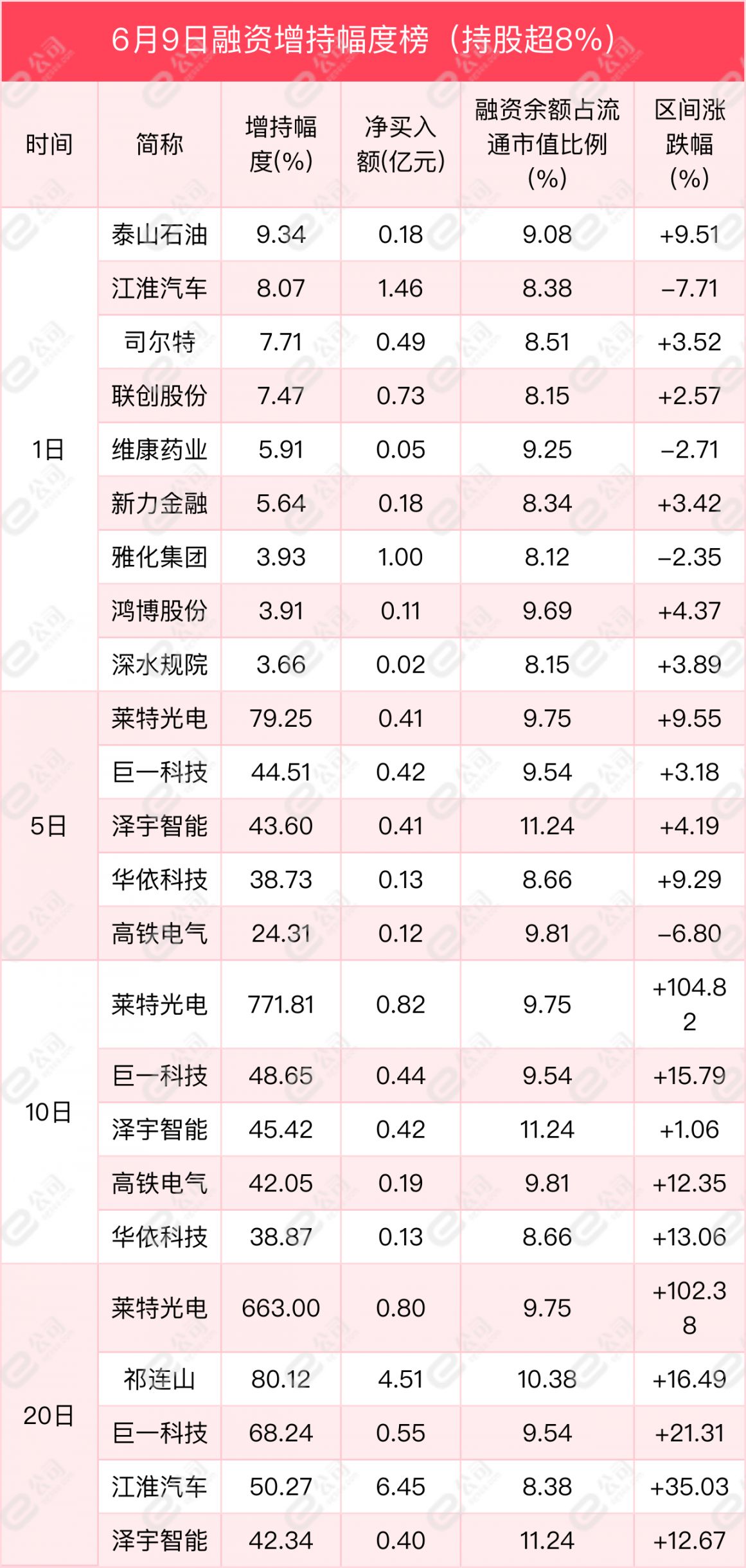 从增减持幅度来看,融资余额占流通股比例超8%的个股中,泰山石油、江淮汽车、司尔特获融资增持幅度居前,分别为9.34%、8.07%、7.71%。
