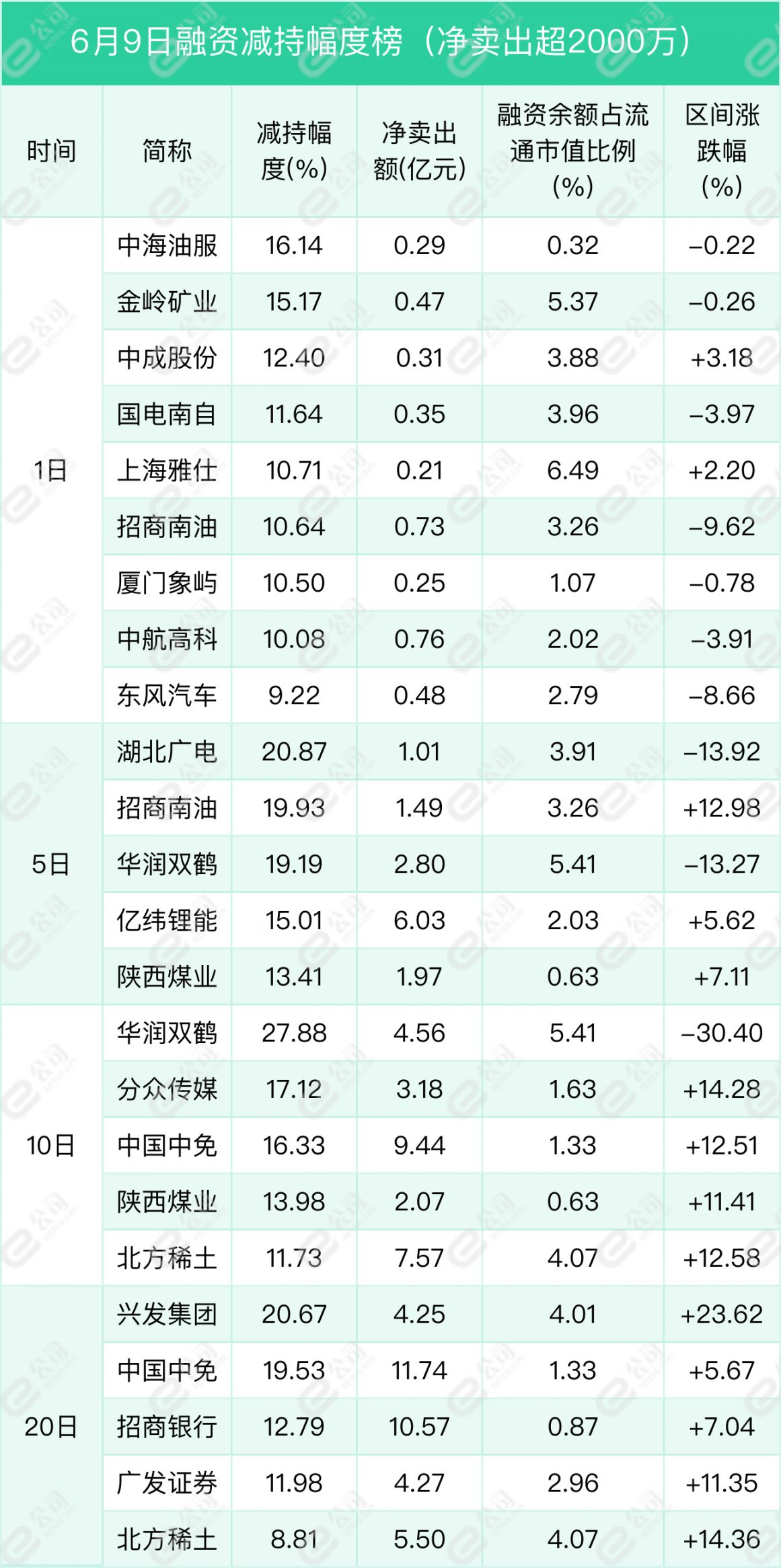 中海油服、金岭矿业、中成股份遭融资减持幅度居前,分别为16.14%、15.17%、12.4%。