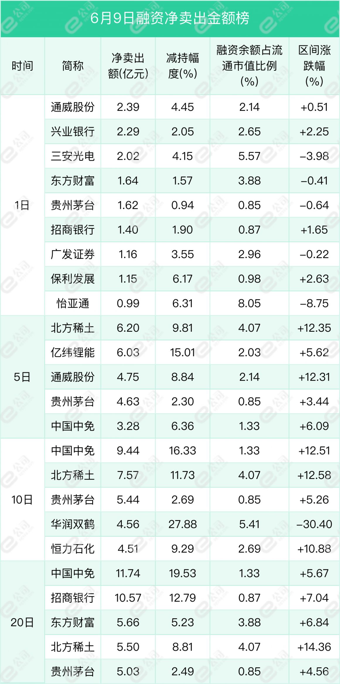 通威股份、兴业银行、三安光电遭融资净卖出金额居前,分别为2.39亿元、2.29亿元、2.02亿元,减持幅度分别为4.45%、2.05%、4.15%。