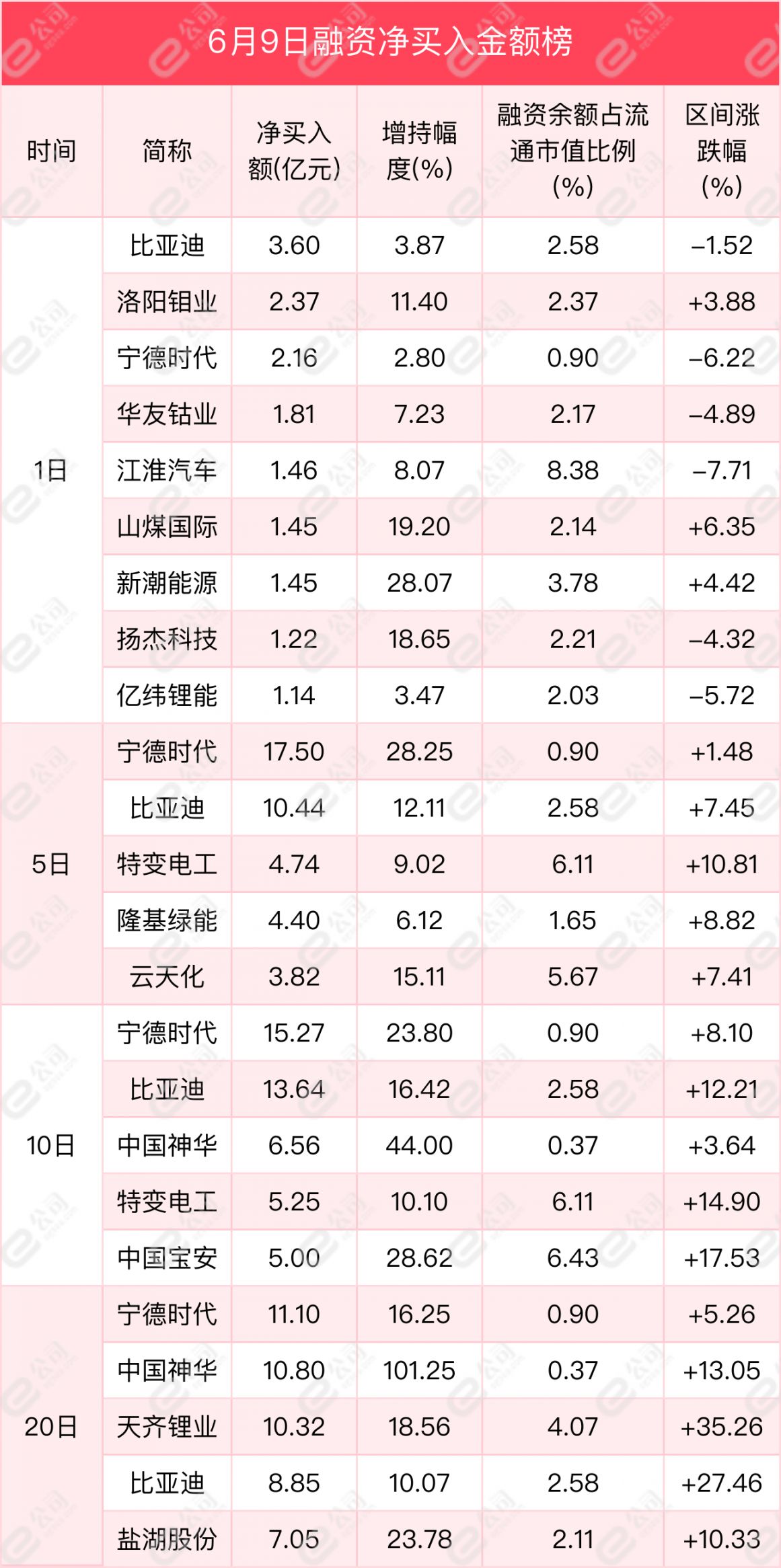 从买卖金额来看,比亚迪、洛阳钼业、宁德时代获融资净买入金额居前,分别为3.6亿元、2.37亿元、2.16亿元,增持幅度分别为3.87%、11.4%、2.8%。