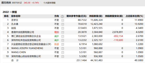 从前十大流通股东的情况看,截至5月31日,德方纳米前十大股东中,谢治宇、董理、童兰共同管理的兴全趋势投资基金现身,持股数量为227.96万股,较一季度末的持股增加了119.09万股,持仓股份数量翻了一倍多,期末参考持股市值为6.78亿元。