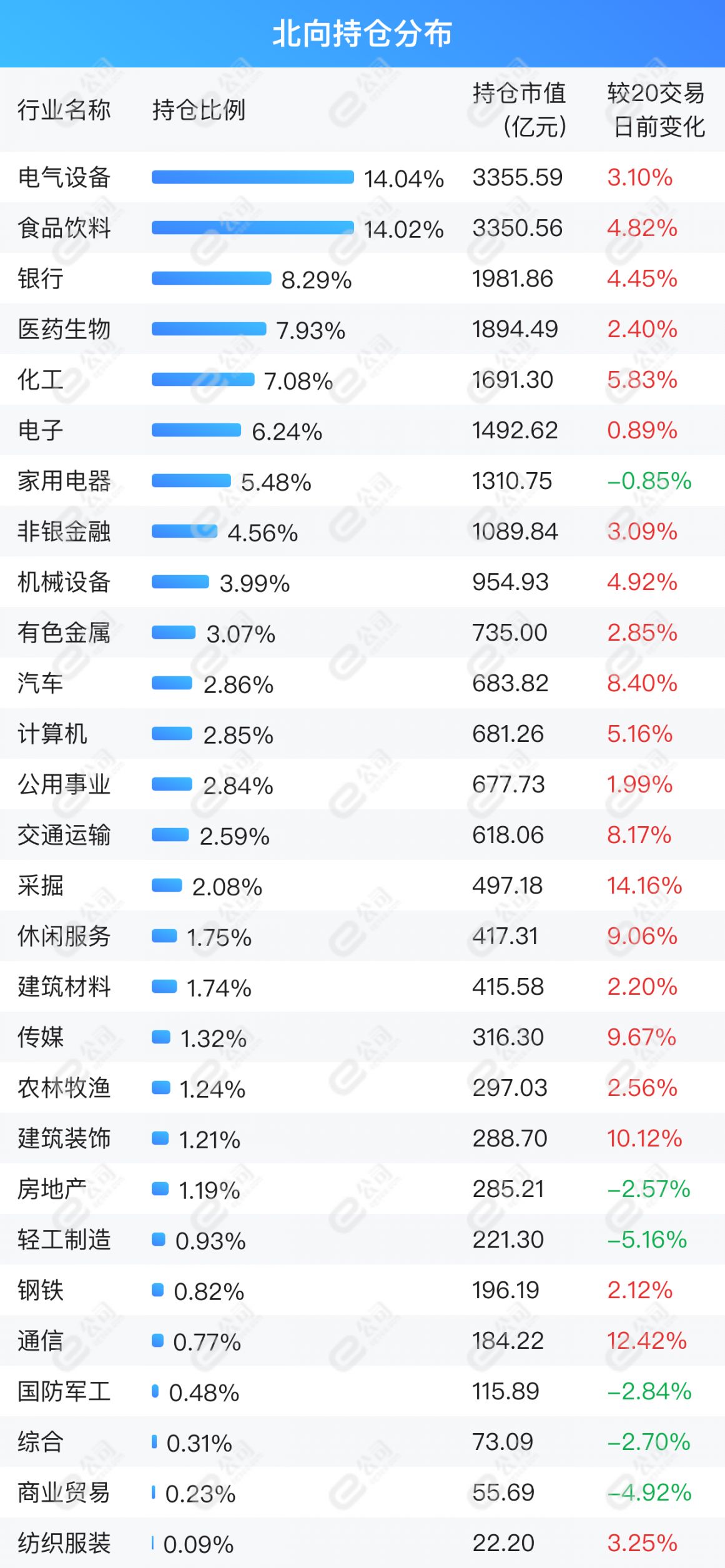 北向资金持仓市值前五行业为电气设备、食品饮料、银行、医药生物、化工,占持仓总市值51.35%。
