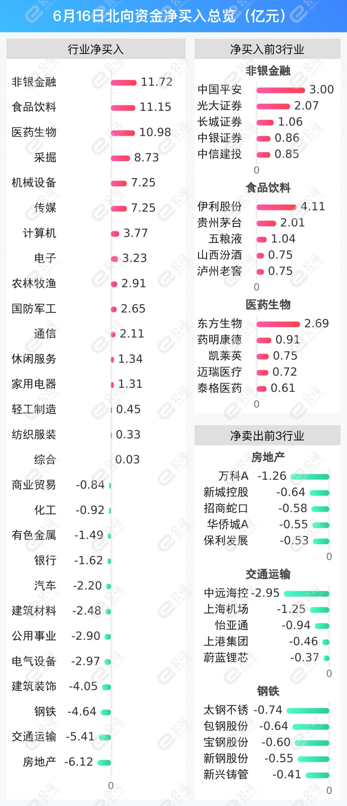 非银金融、食品饮料、医药生物获北向资金净买入金额居前,分别为11.72亿元、11.15亿元、10.98亿元。