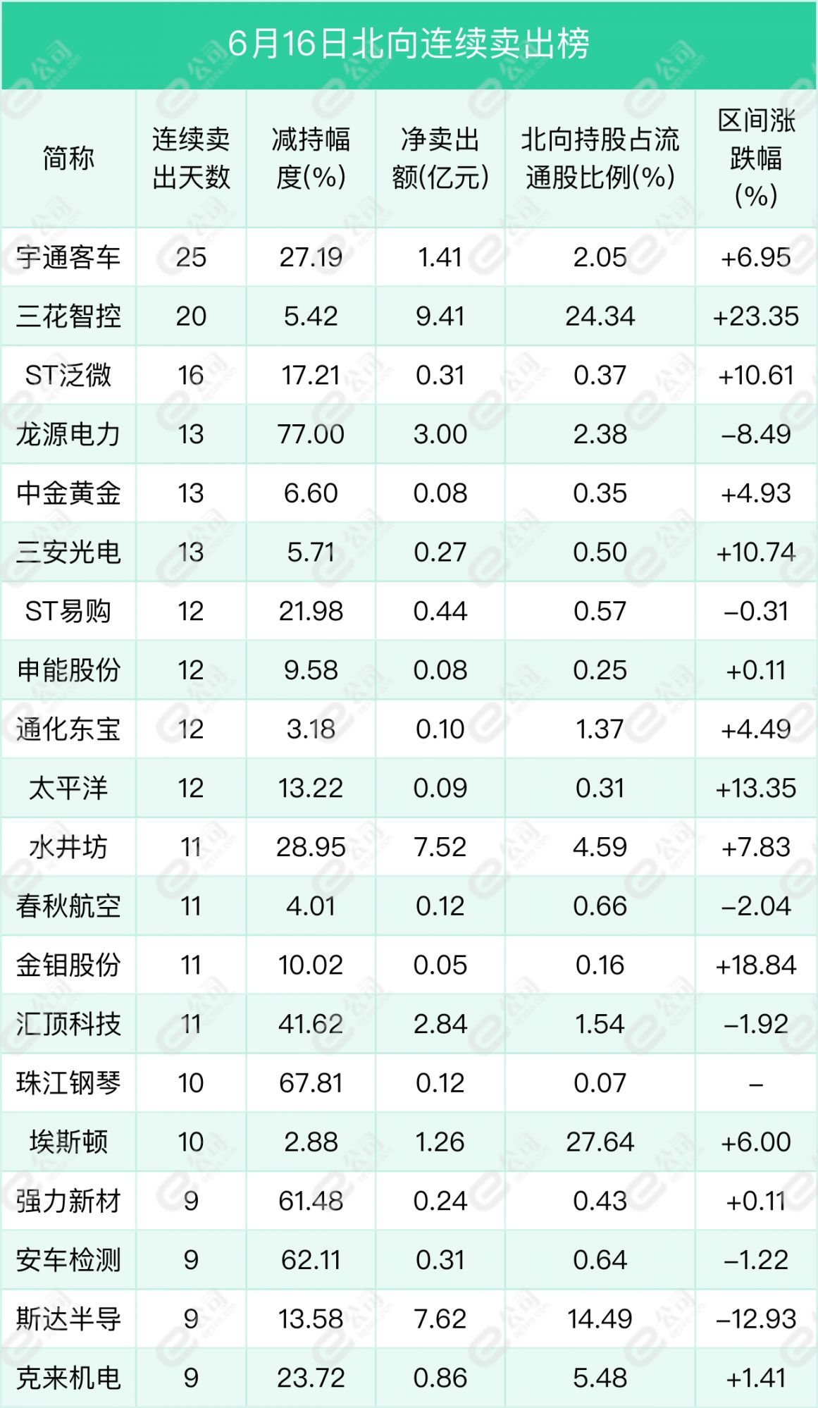 宇通客车、三花智控、ST泛微遭北向资金连续净卖出天数居前,分别为25天、20天、16天,期间净卖出额分别为1.41亿元、9.41亿元、0.31亿元,期间减持幅度分别为27.19%、5.42%、17.21%。