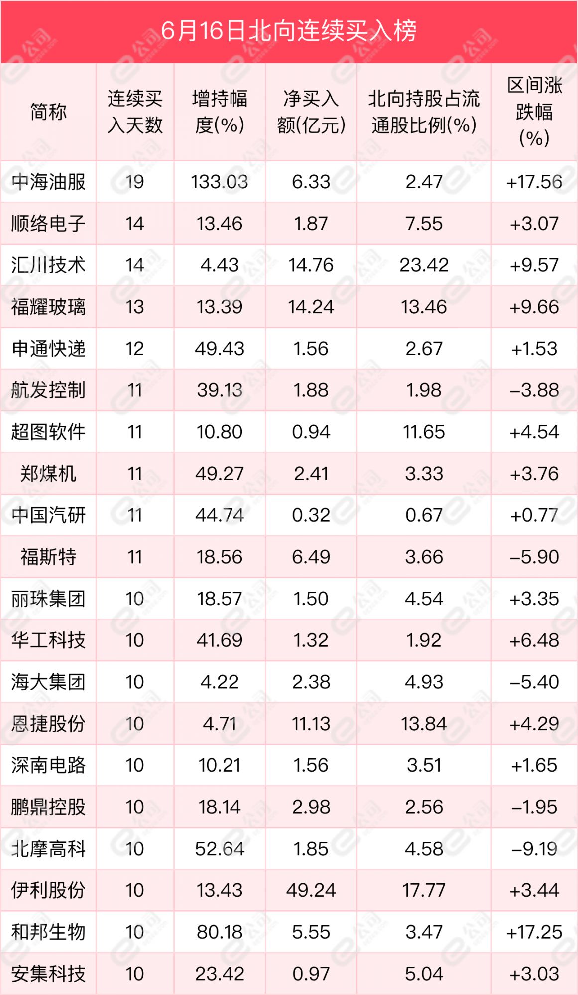 从连续买卖来看,中海油服、顺络电子、汇川技术获北向资金连续净买入天数居前,分别为19天、14天、14天,期间净买入额分别为6.33亿元、1.87亿元、14.76亿元,期间增持幅度分别为133.03%、13.46%、4.43%。