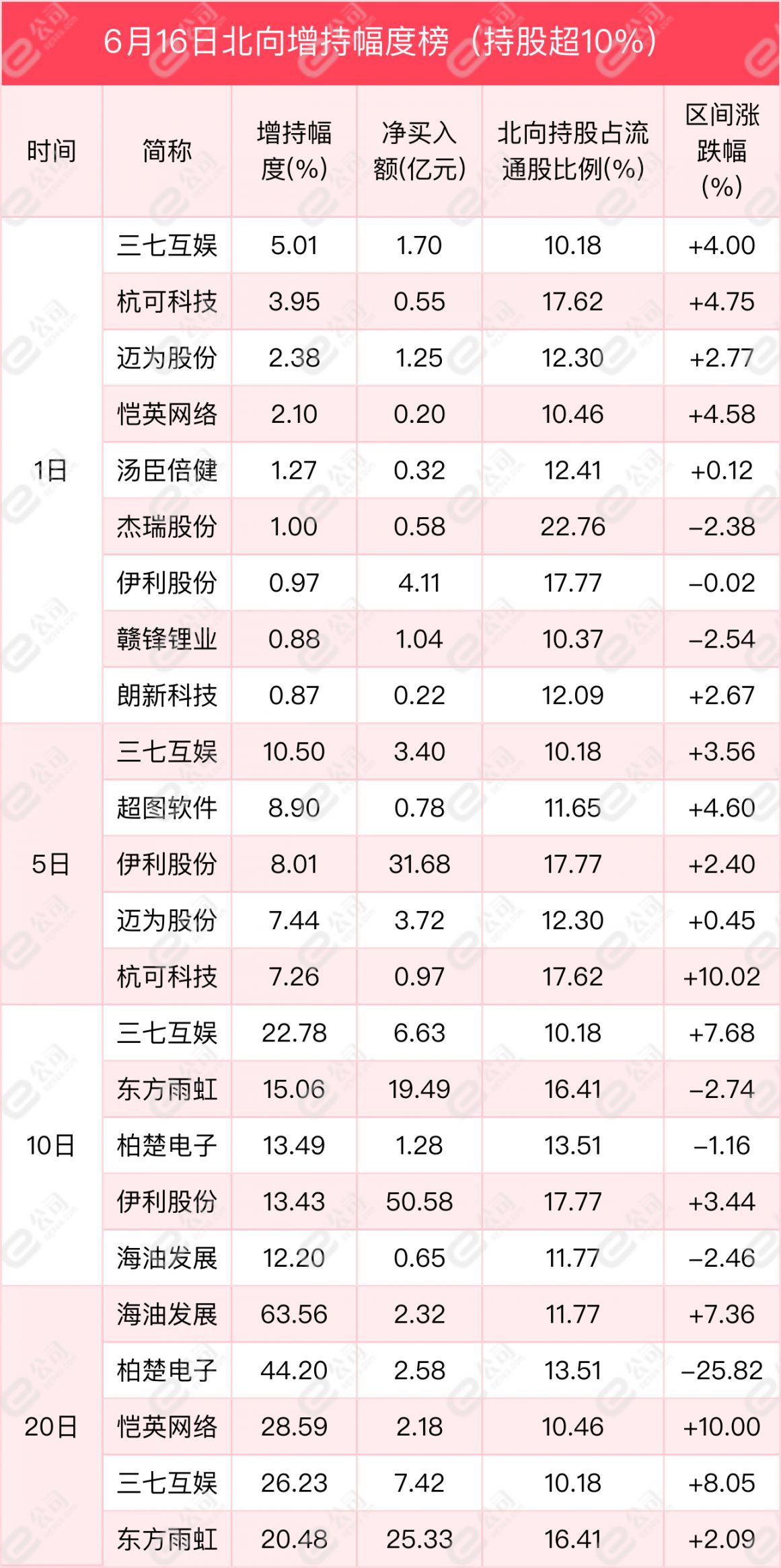 从增减持幅度来看,北向资金持股占流通股比例超10%的个股中,三七互娱、杭可科技、迈为股份获北向资金增持幅度居前,分别为5.01%、3.95%、2.38%。