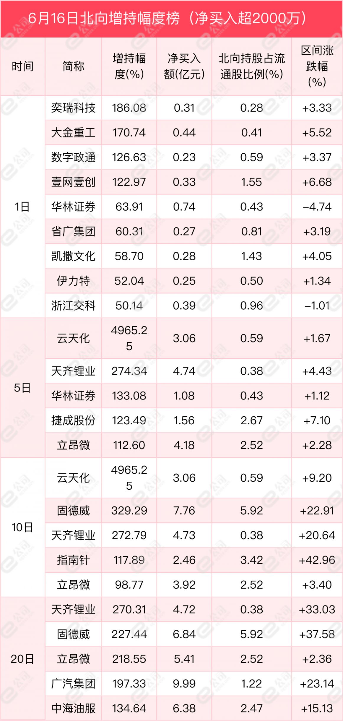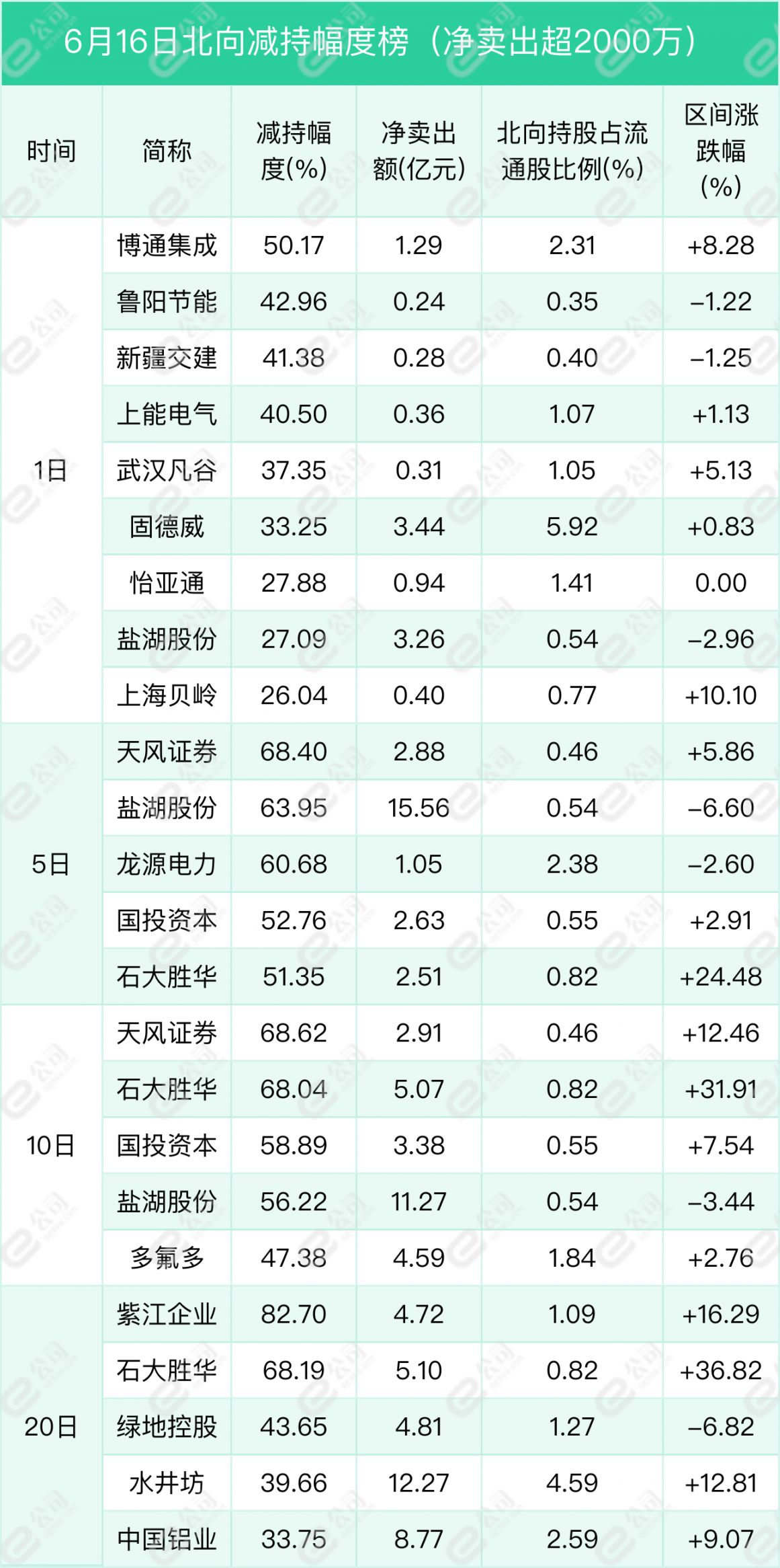 e公司数据统计显示,6月16日北向资金单日净买入44.52亿元,其中沪股通净买入32.54亿元,深股通净买入11.98亿元。北向资金成交金额1144.82亿元,占A股总成交额10.65%,交易活跃度下降17.40%,其中沪股通买入金额274.56亿元,卖出金额242.02亿元,深股通买入金额320.10亿元,卖出金额308.12亿元。