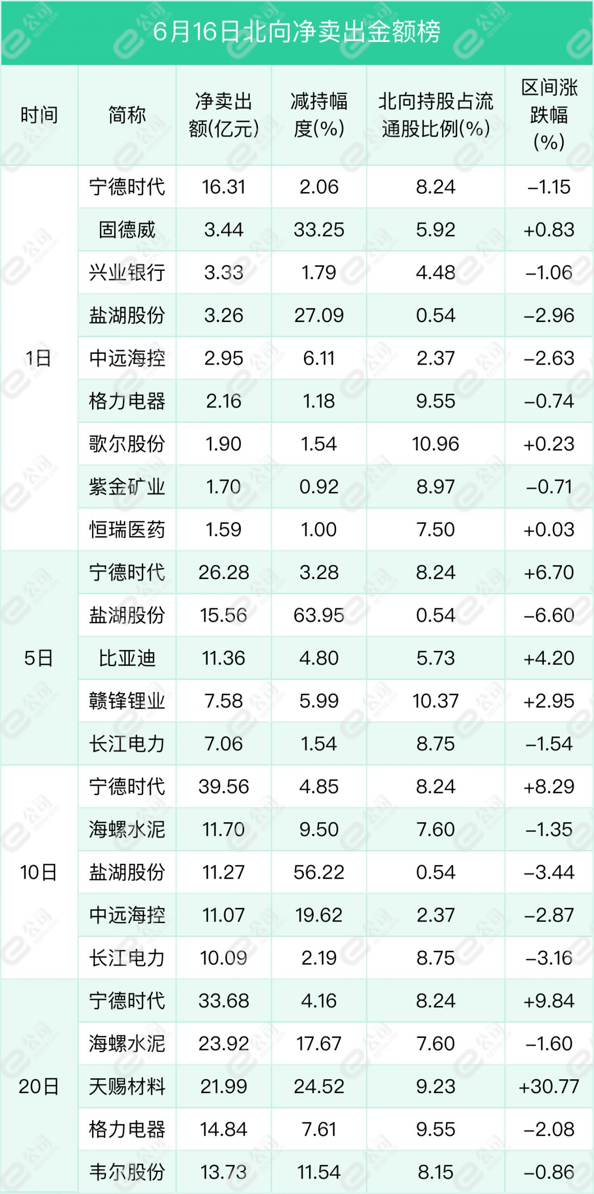 宁德时代、固德威、兴业银行遭北向资金净卖出金额居前,分别为16.31亿元、3.44亿元、3.33亿元,减持幅度分别为2.06%、33.25%、1.79%。