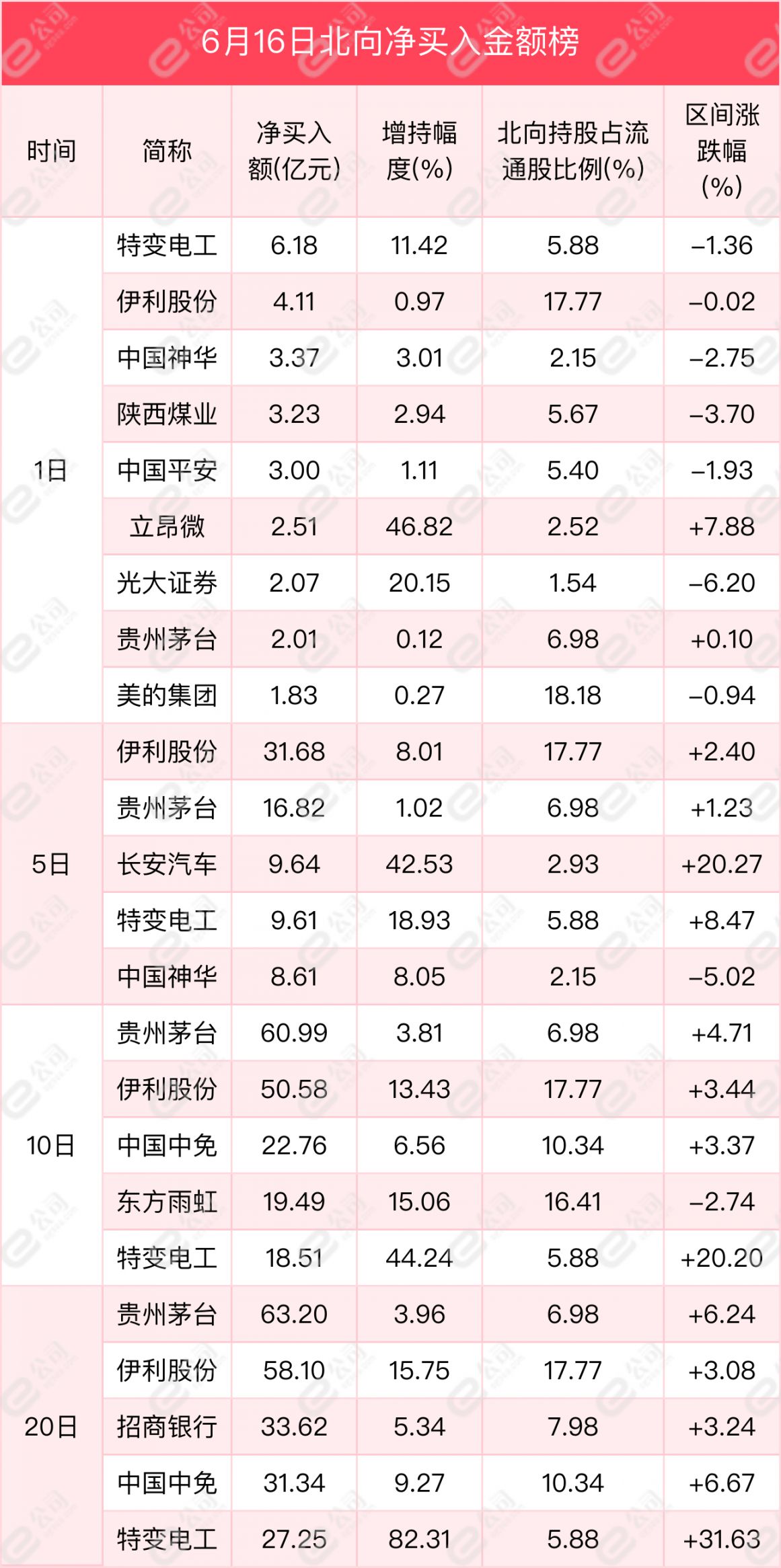 从买卖金额来看,特变电工、伊利股份、中国神华获北向资金净买入金额居前,分别为6.18亿元、4.11亿元、3.37亿元,增持幅度分别为11.42%、0.97%、3.01%。