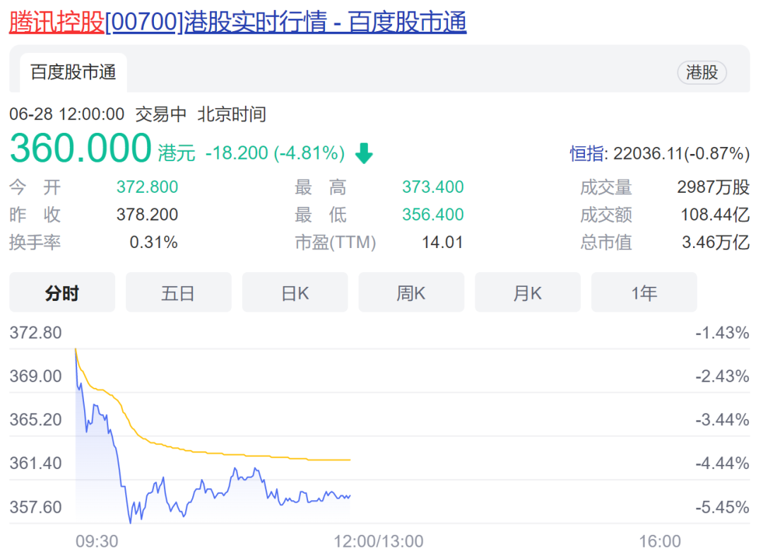 当日午后开盘,腾讯控股断崖式下跌,今日早间继续低开低走,盘中一度跌近6%,两日市值最多损失约4200亿港元。而腾讯控股的重挫,带动港股市场科技股整体下跌,截至发稿,哔哩哔哩跌逾4%,京东集团、网易、阿里巴巴等全线走弱。