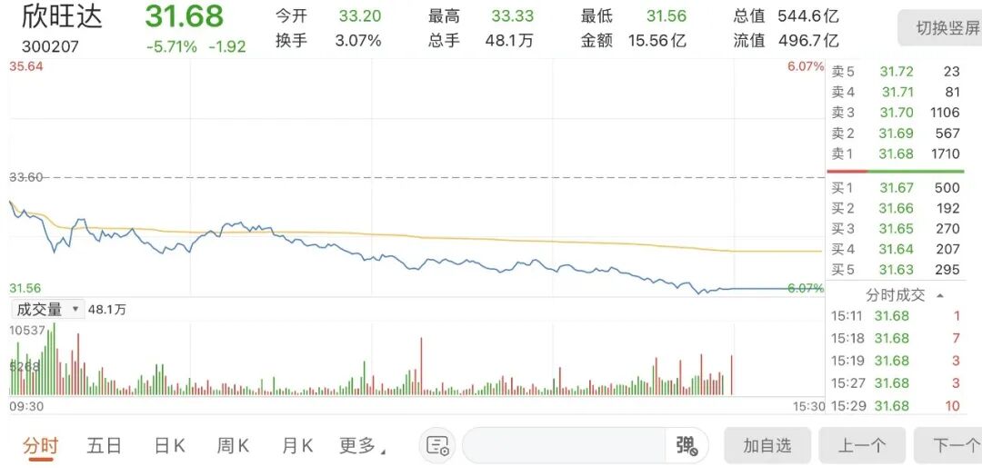 6月29日,欣旺达低开低走,收跌5.71%,报31.68元/股,总市值544.6亿元。