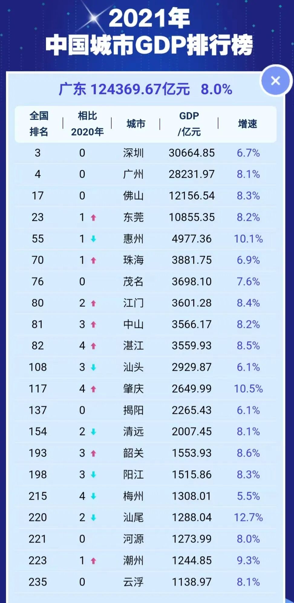 可以看到,十强区广东独占八席,且包揽前三,其中深圳4席、广州2席、佛山2席。